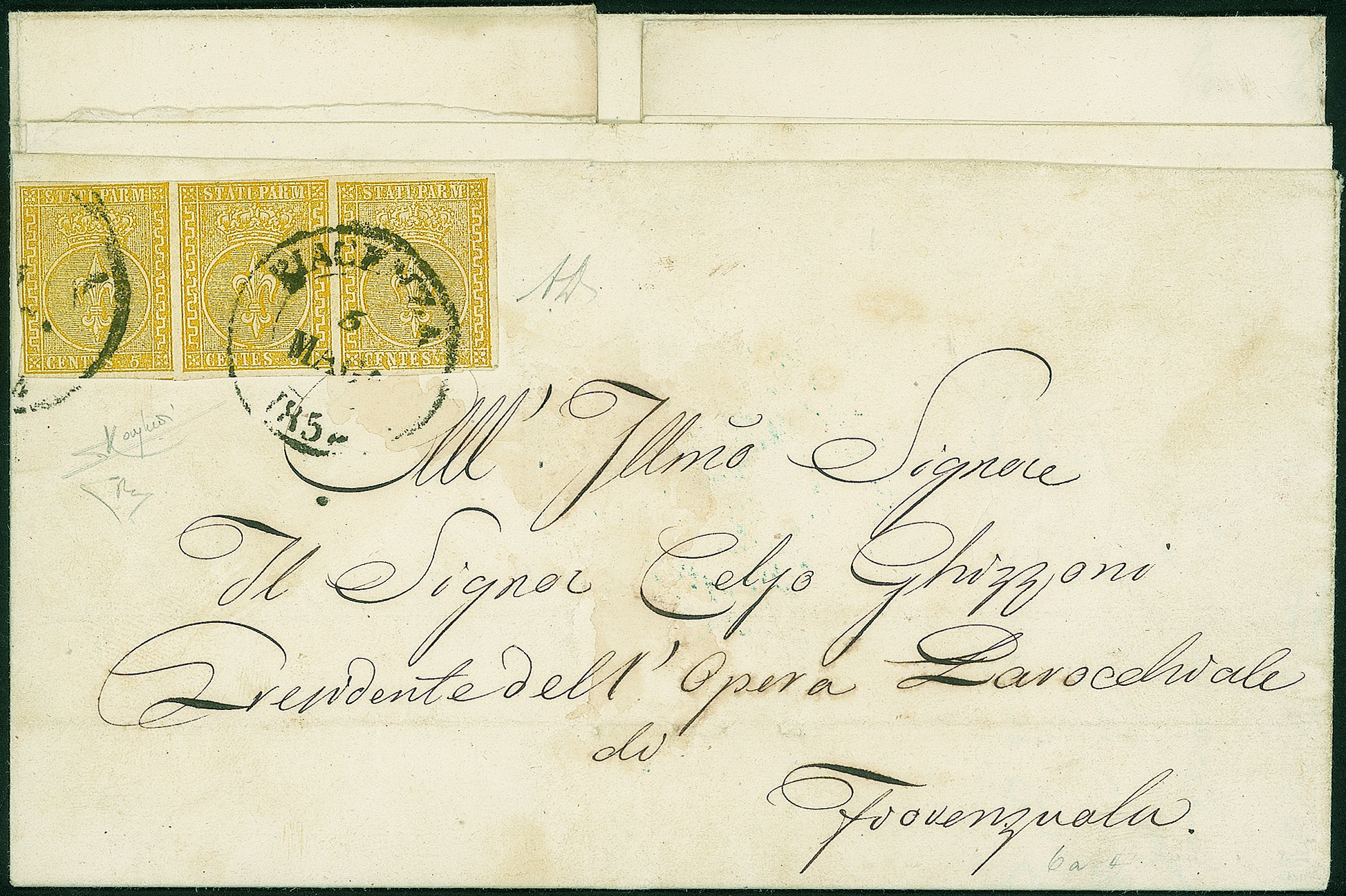 Antichi Stati Italiani - Parma - Lettera con striscia di tre 5 cent giallo (6a)
