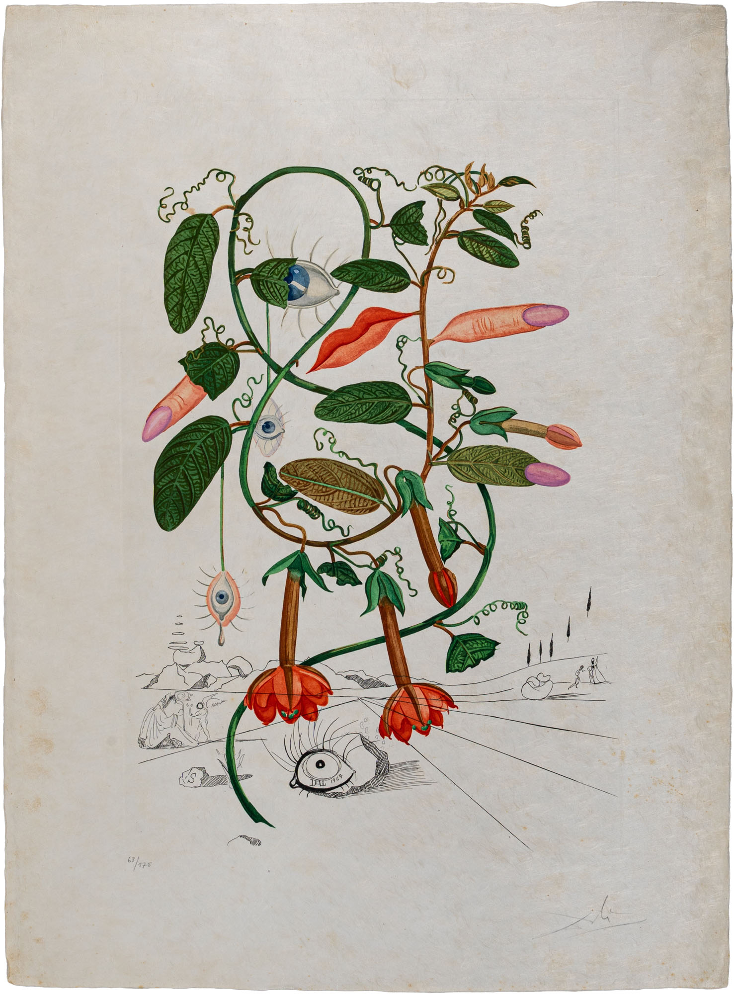 Acquaforte e acquatinta, es. 63/175, dalla cartella Flora Dalinae, editori Jean Schneider, Basilea e Michelle Broutta, Parigi