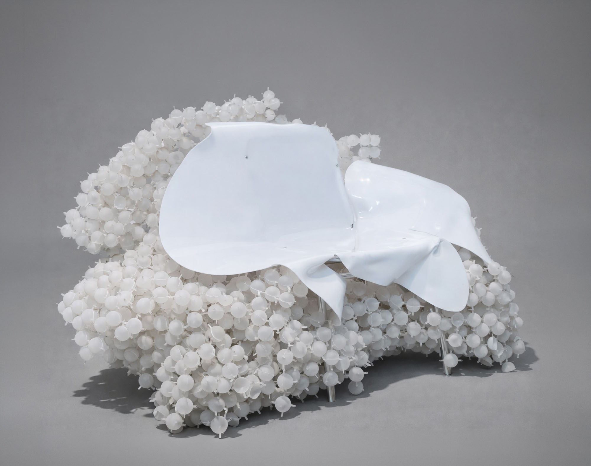 Sedia in alluminio, PETG bianco opalino, moduli in PTFE bianco, fascette di plastica