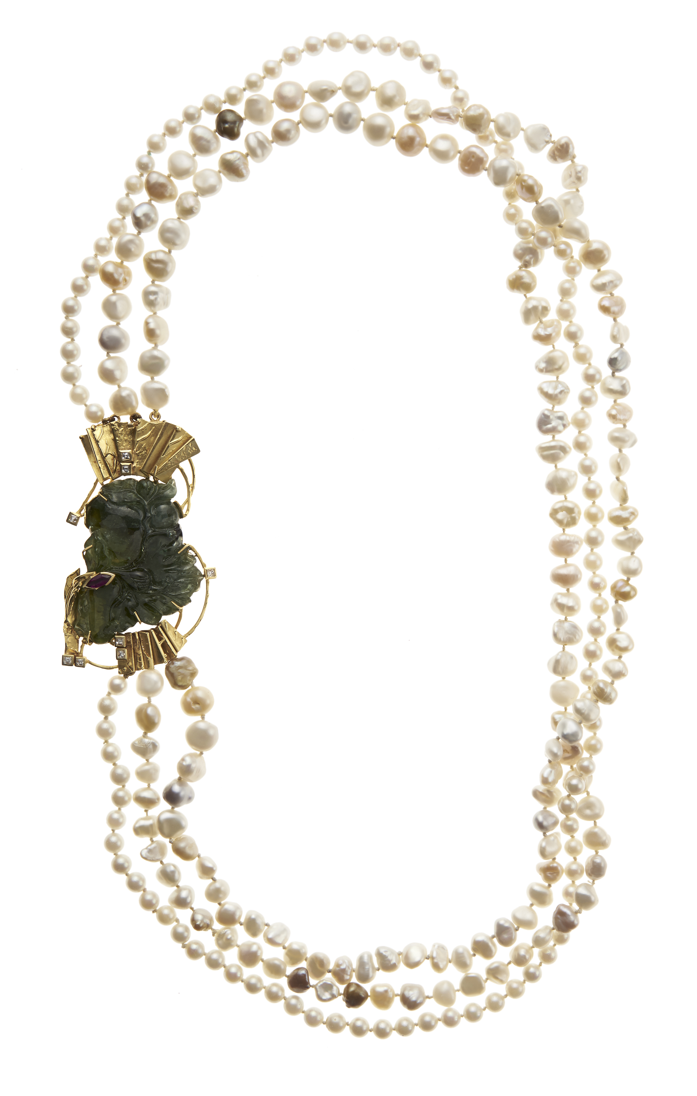 Composed of two rows of water pealrs and one row of cultivated pearls to a 18kt yellow gold central, green gemstone and navette-cut diamonds and rubies