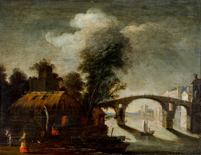 School of central Italy of the XVII century - River landscape with figures and boats