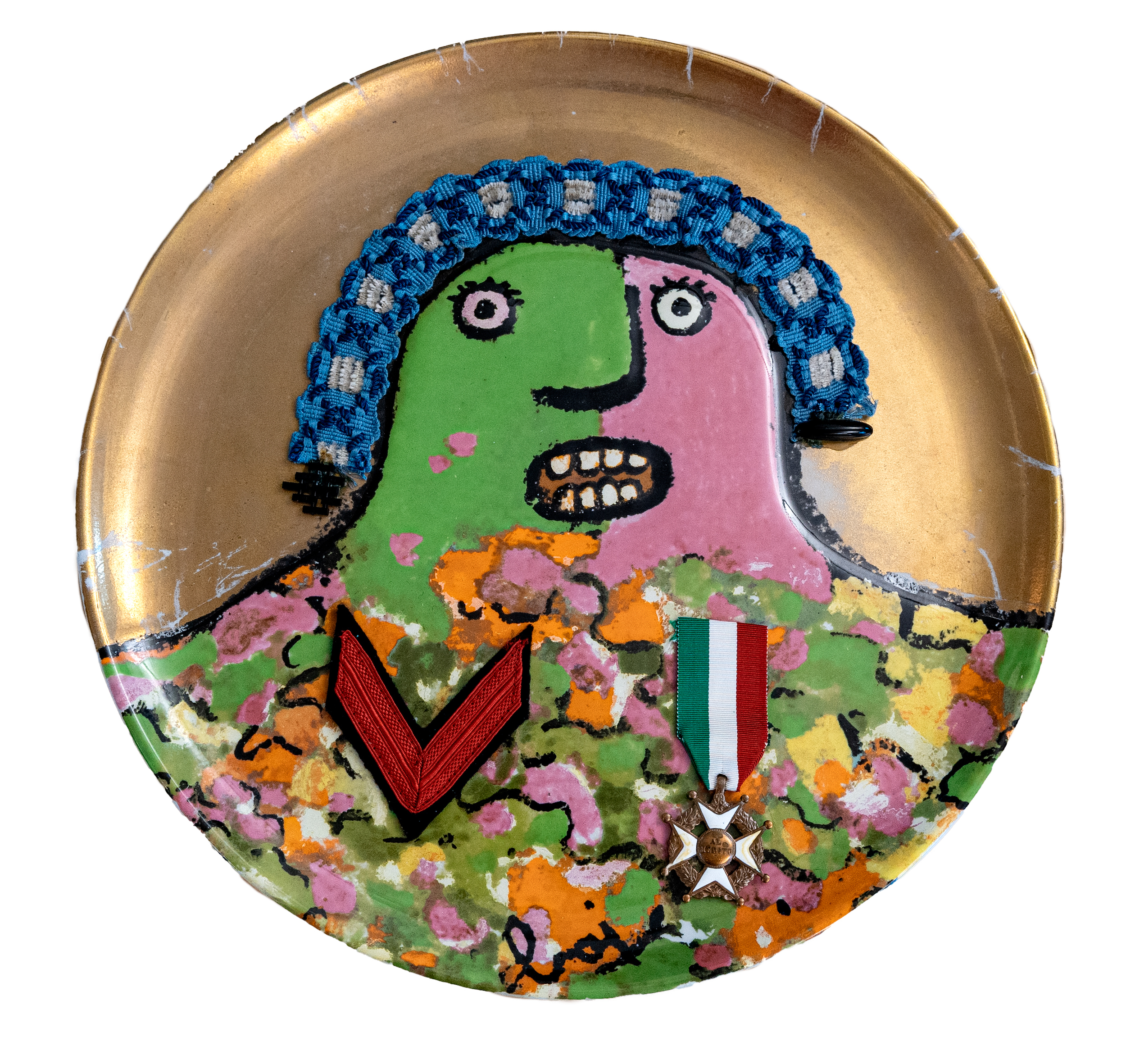Polychrome and gold glazed ceramic plate with applications, ed. 101/3000, Edizioni Ceramica Franco Pozzi, Gallarate, with the collaboration of Studio Marconi, Milan