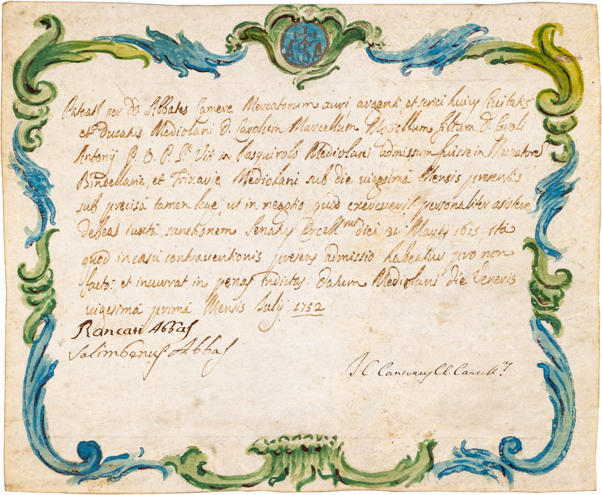 Ducato di Milano - Licenza di vendita manoscritta su pergamena, rilasciata dalla Camera dei Mercanti nell'anno 1752
