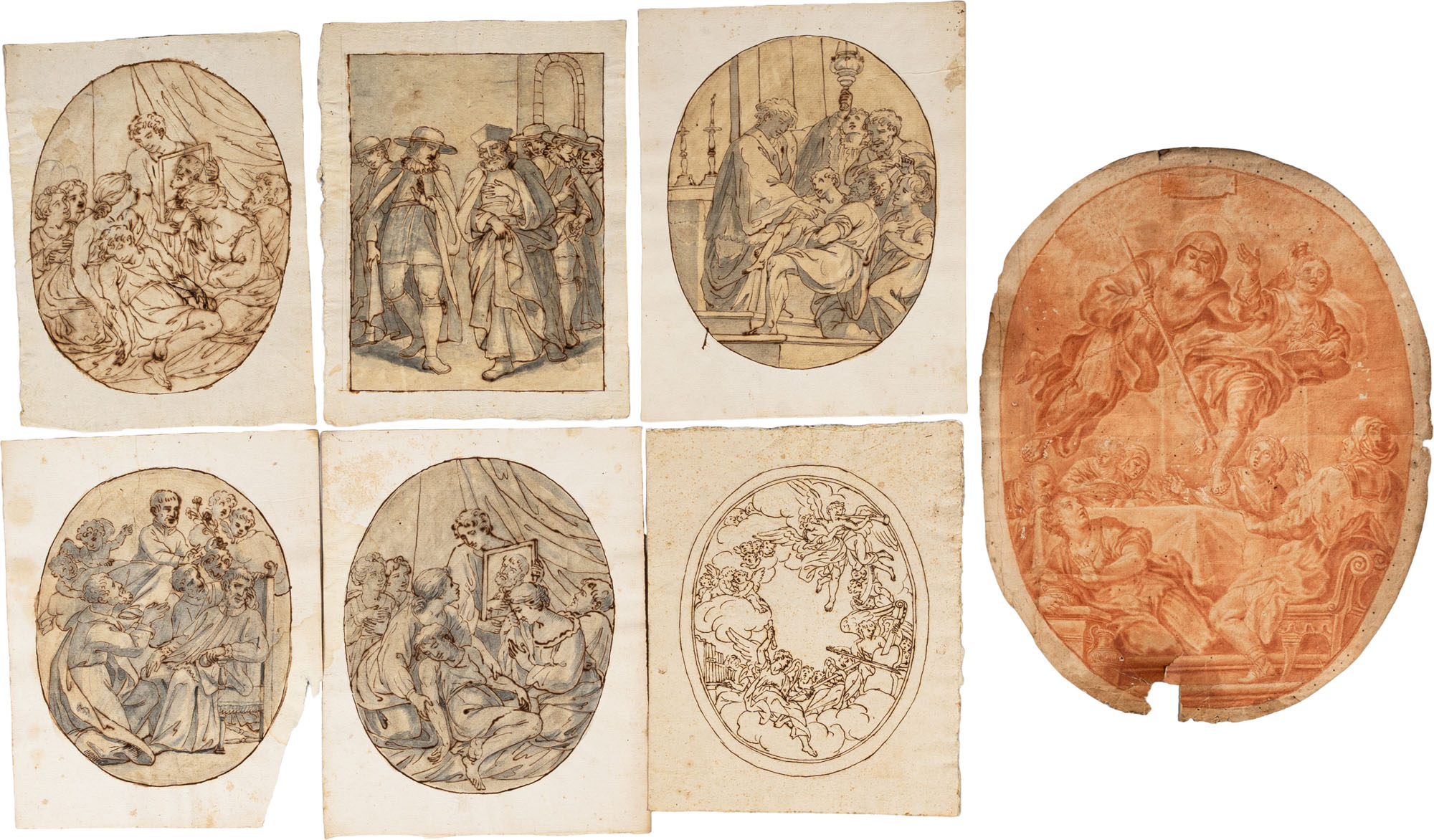 Roman school (?) of the 18th century - Seven pen and bistro drawings and one red pencil drawing