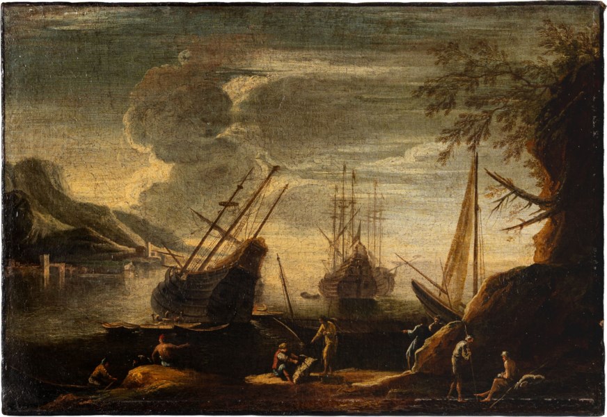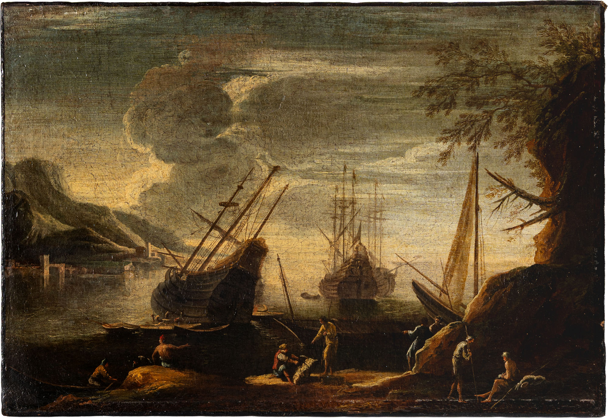 Italian school of the 17th century - Marina with ships in the harbour and figures