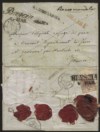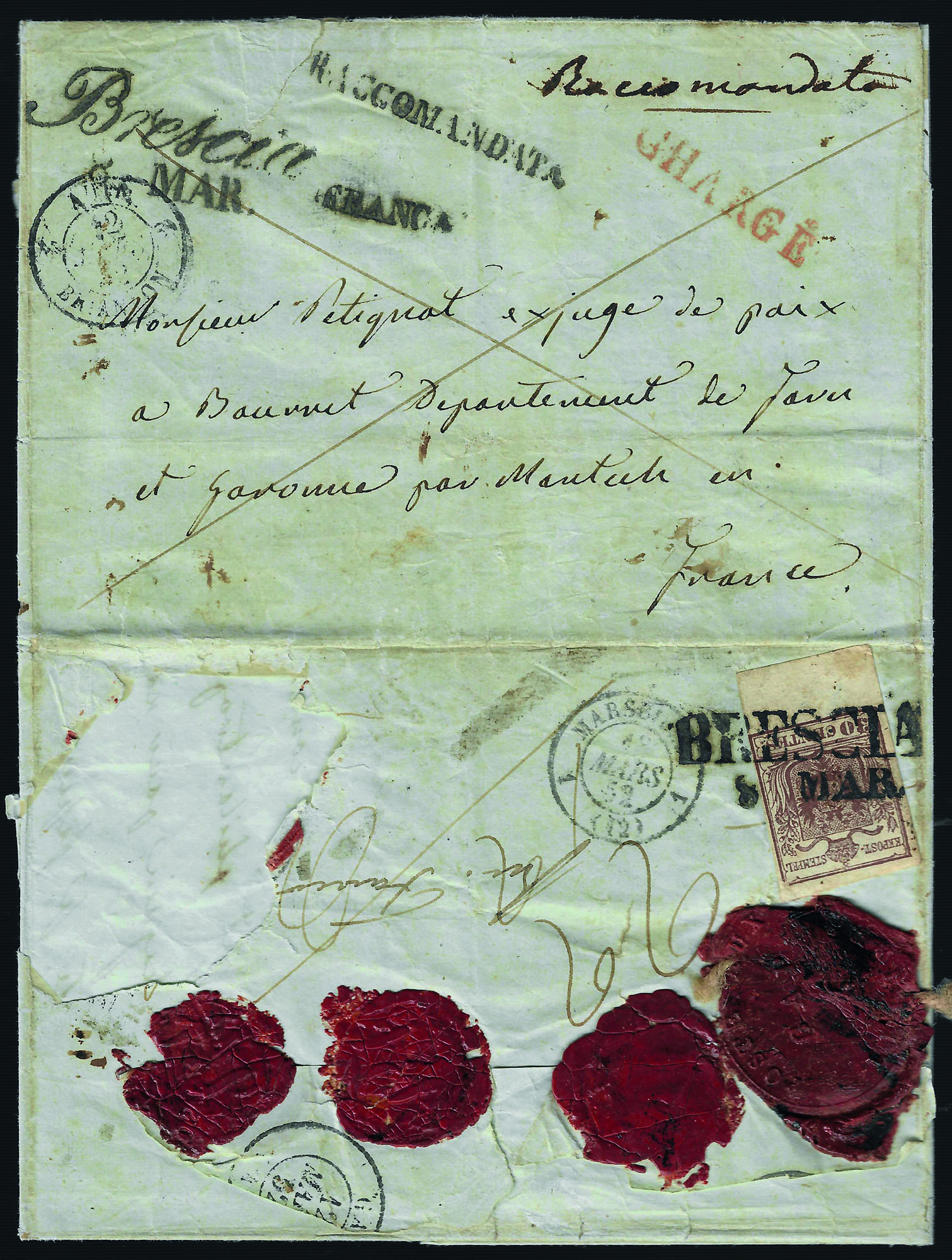 Con lineare FRANCA e RACCOMANDATA, a lato il bollo rosso CHARGE + manoscritto Raccomandata, al verso sigilli in ceralacca e c.30 bruno I tipo con bordo di foglio, segni della tassazione e bolli di arrivo, rara