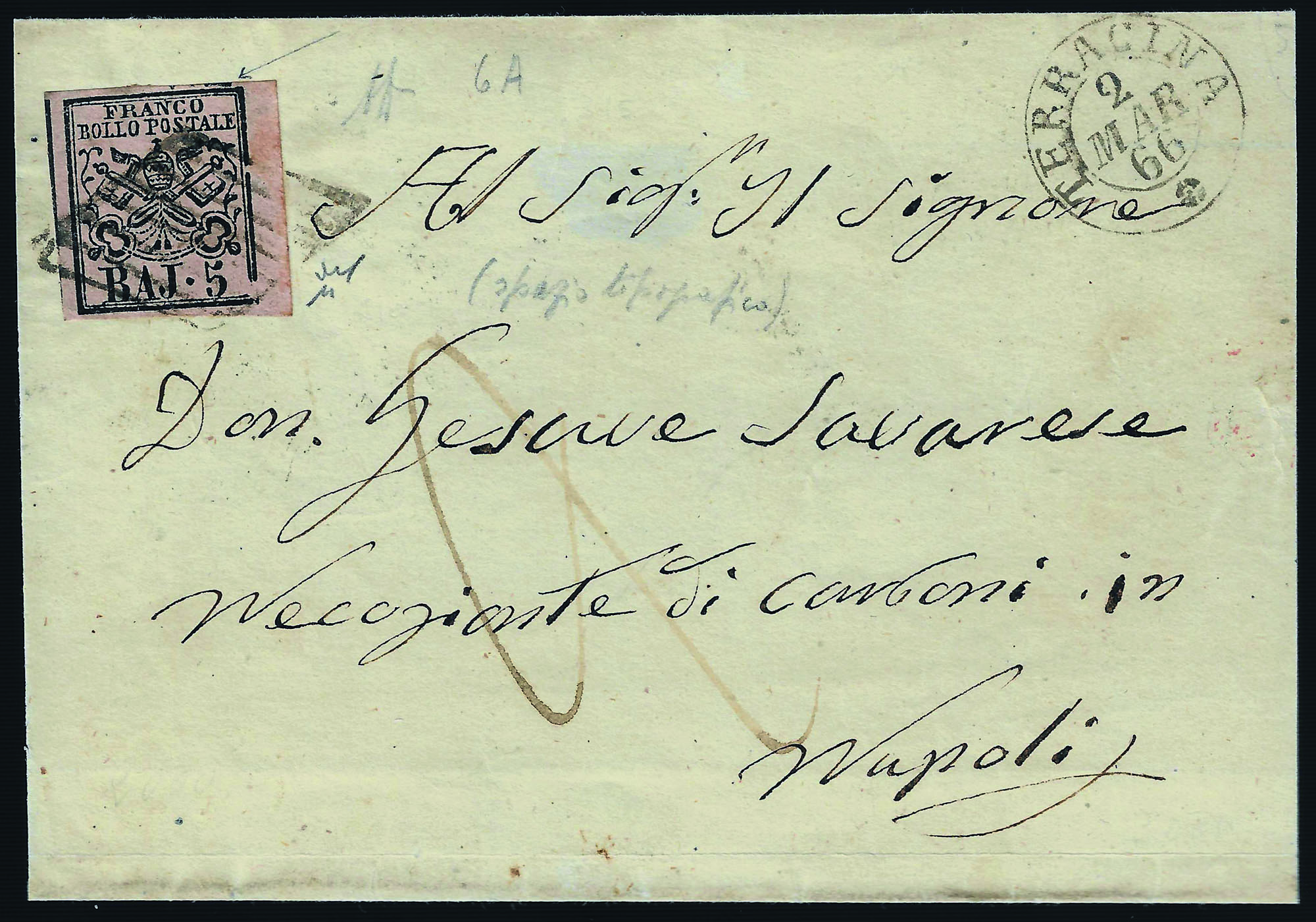 Con varietà di stampa sul lato destro e presenza dello spazio tipografico in alto, da TERRACINA 2 MAR.66 per Napoli, inconsueta varietà