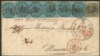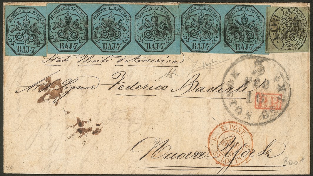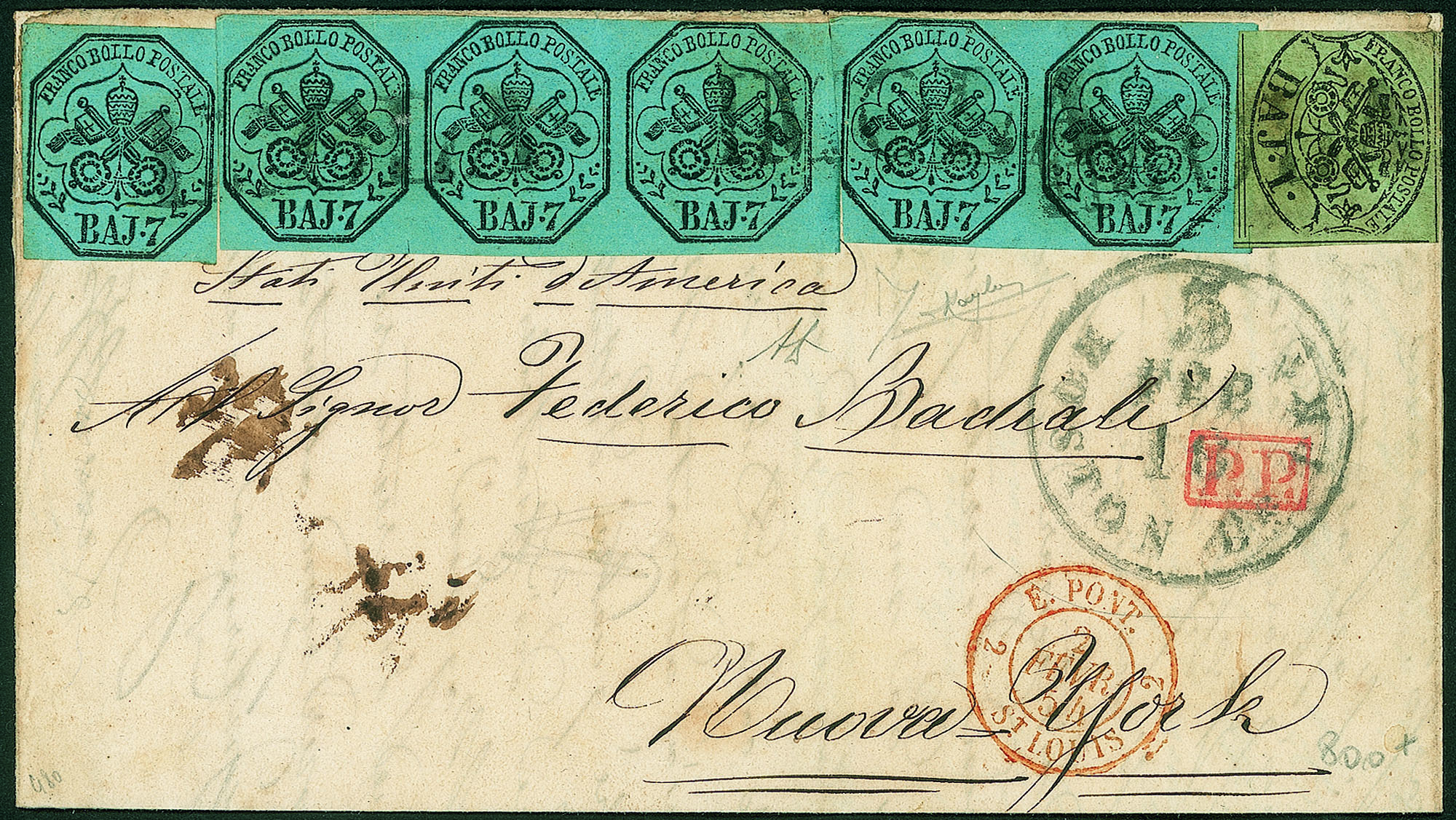 Antichi Stati Italiani - Stato pontificio - Striscia di tre più una coppia e un singolo del 7 baj azzurro (8) + 1 baj verde grigiastro (2)