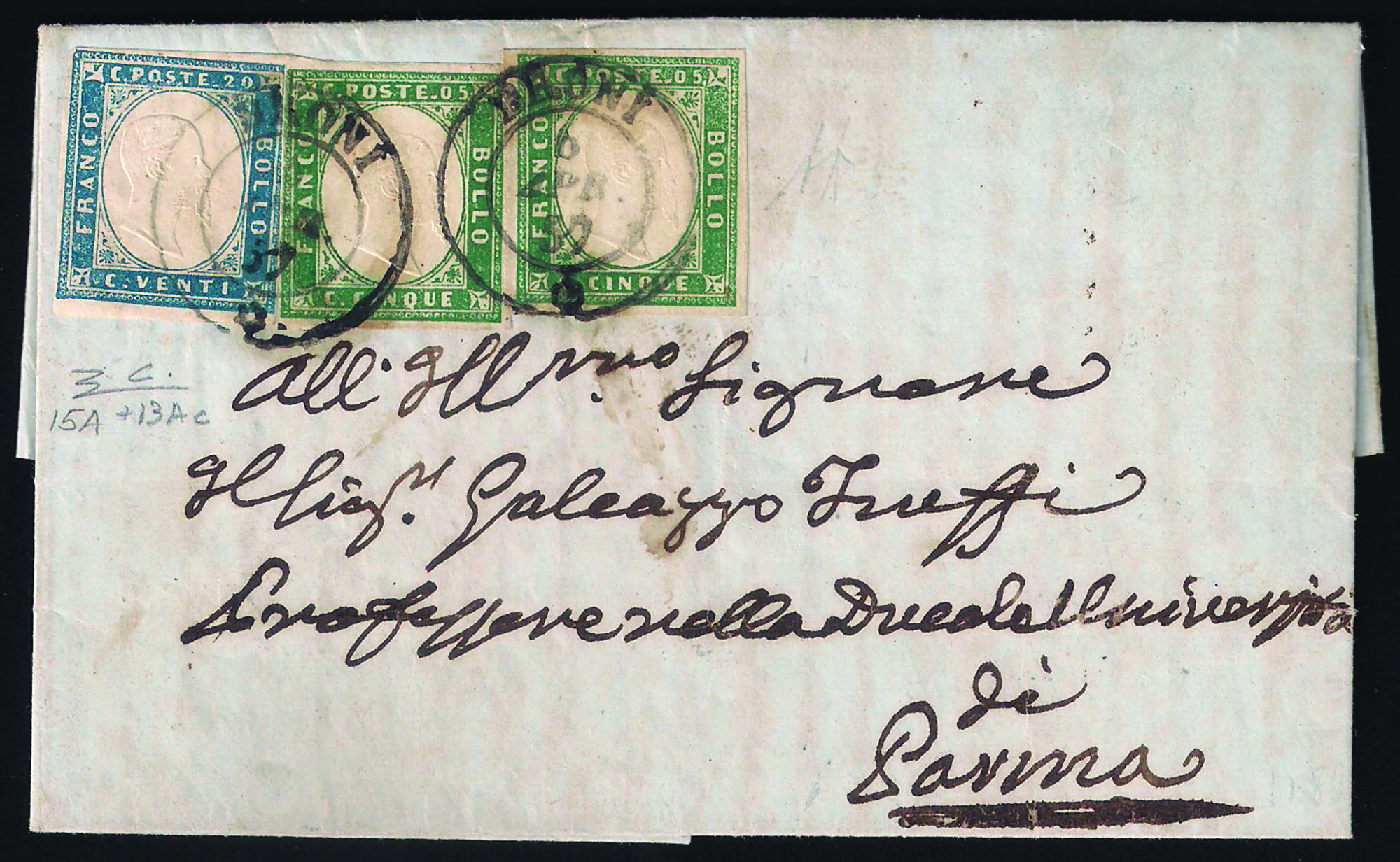 Antichi Stati Italiani - Sardegna - Lettera con coppia c.5 verde smeraldo + c.20 cobalto (13d + 15da)