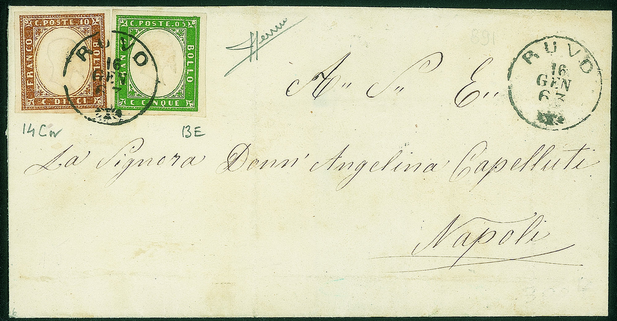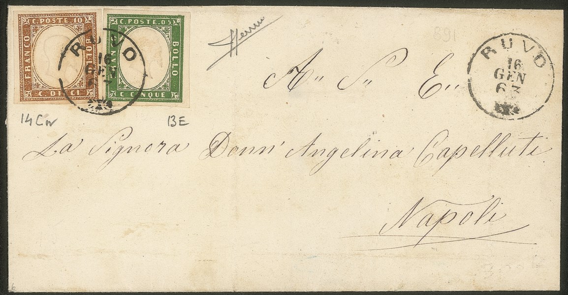 Antichi Stati Italiani - Sardegna - Lettera da Ruvo 16.1.63 affrancata con 10 cent più 5 cent (14Cn + 13E)