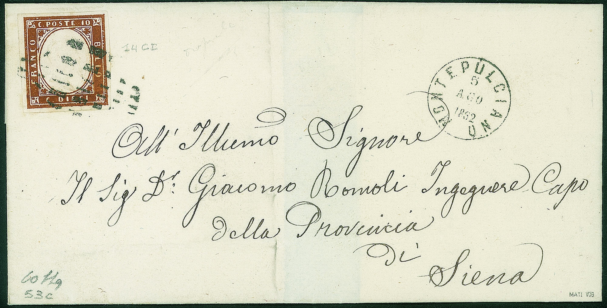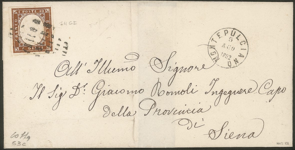 Antichi Stati Italiani - Sardegna - Lettera da Montepulciano 5.8.62 recante 10 cent cioccolato con stampa confusa (14Ci - Rattone 53a)