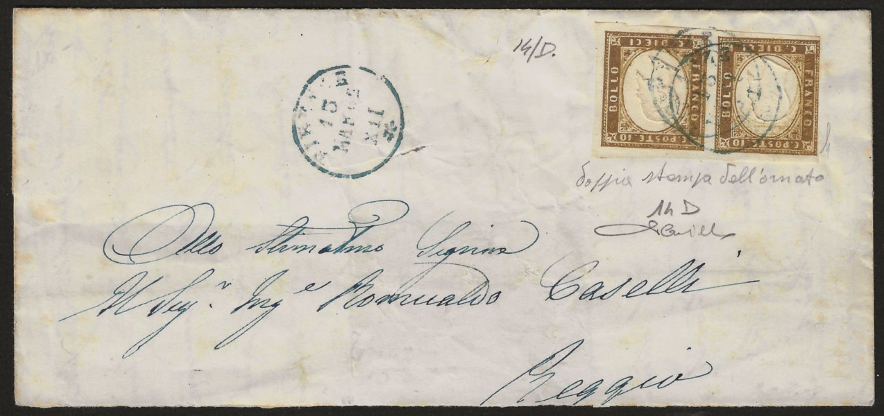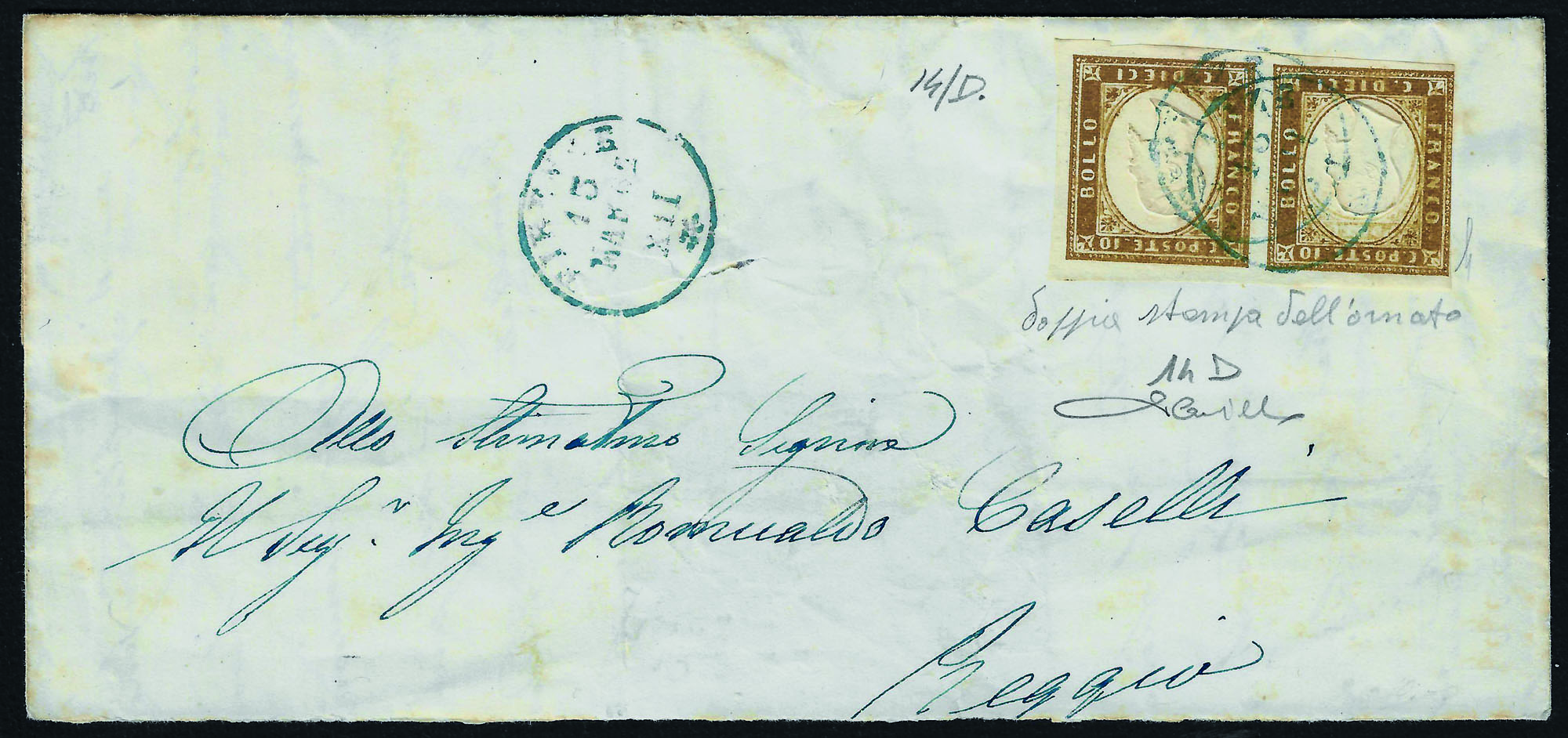 Antichi Stati Italiani - Sardegna - Lettera incompleta in basso affrancata con coppia c.10 bistro oliva (14D)