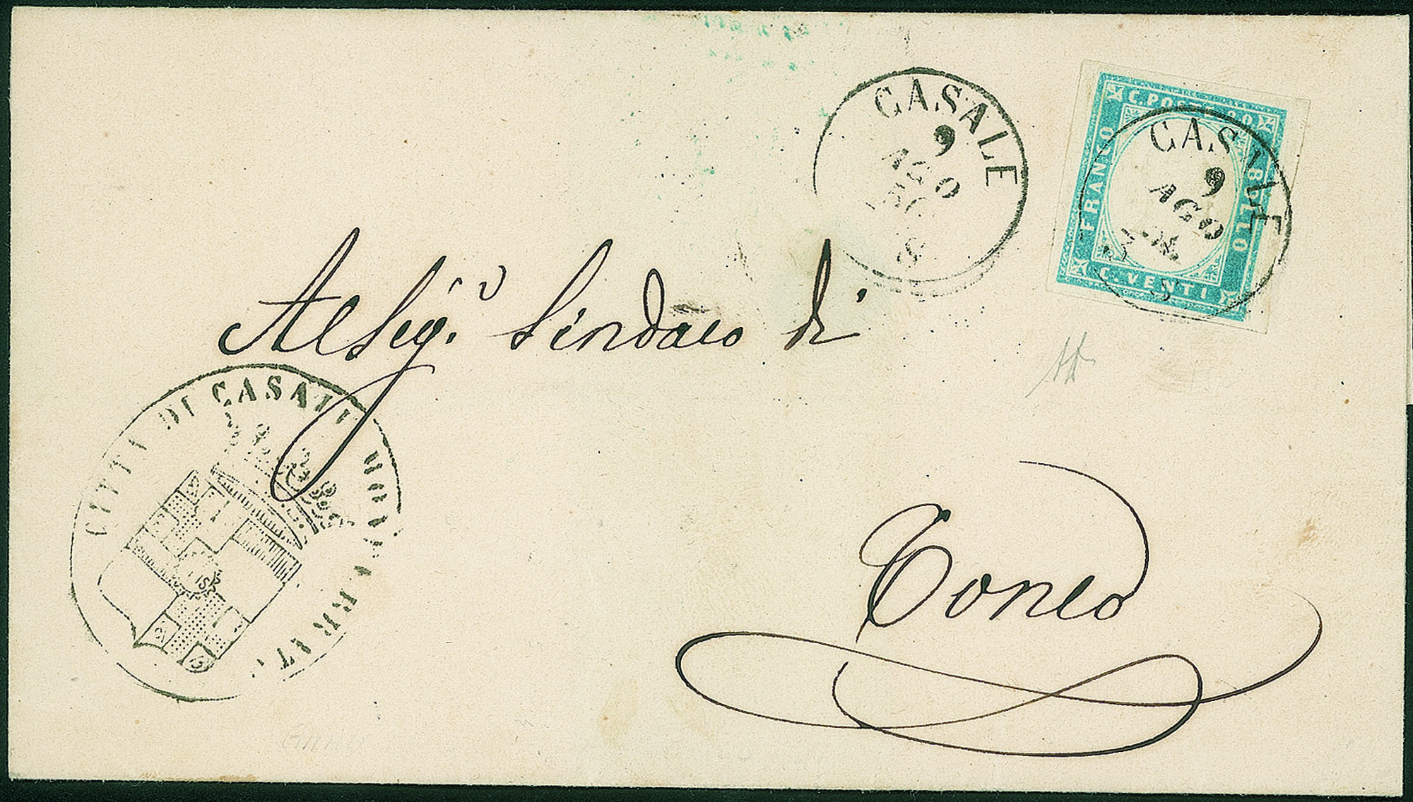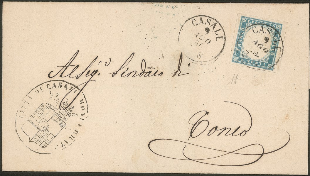 Antichi Stati Italiani - Sardegna - Lettera da Casale 9.8.56 recante 20 cent (15f)