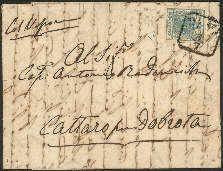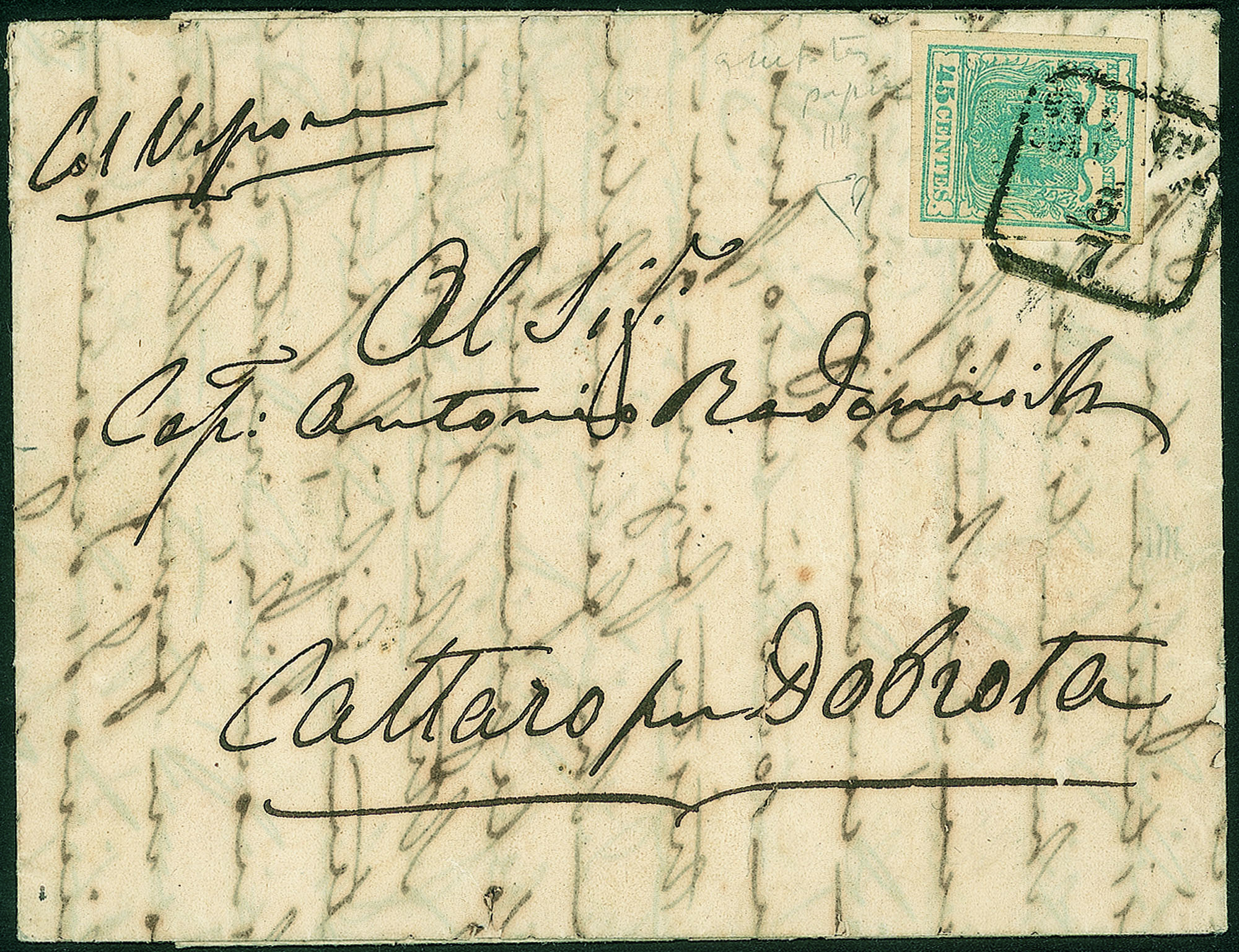 Per Cattaro affrancata con un 45 cent cotelè (17) annullato allo sbarco a Trieste con bollo Da Venezia col Vapore - ottimi margini - cert. ED
