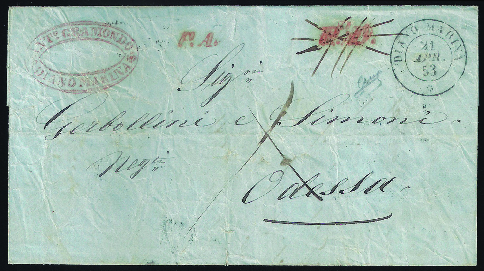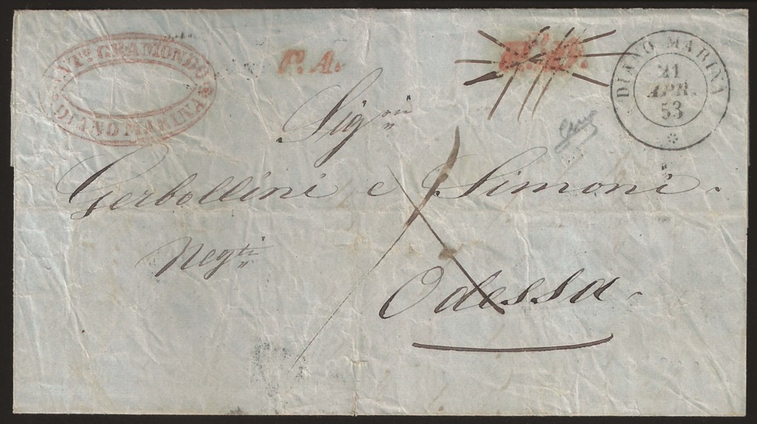Per Odessa con bollo P.D. in rosso, cancellato e apposto il raro bollo P.A. in rosso (Porto Austriaco), al verso la tassa di 10 decimi pagata in partenza, molto rara