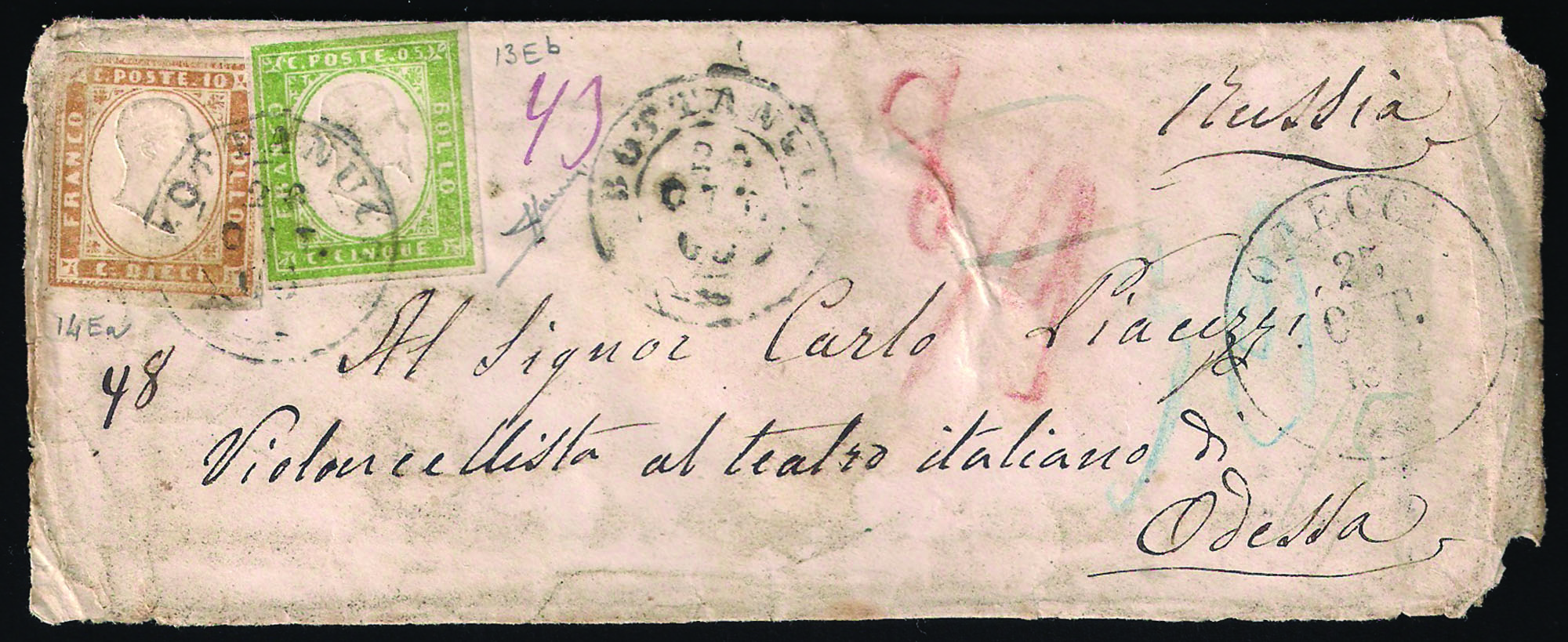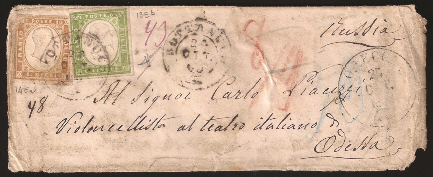 Antichi Stati Italiani - Sardegna - Destinazioni - Bustina per la Russia affrancata con c.5 verde chiaro smorto + c.10 bistro (13Eb+14)