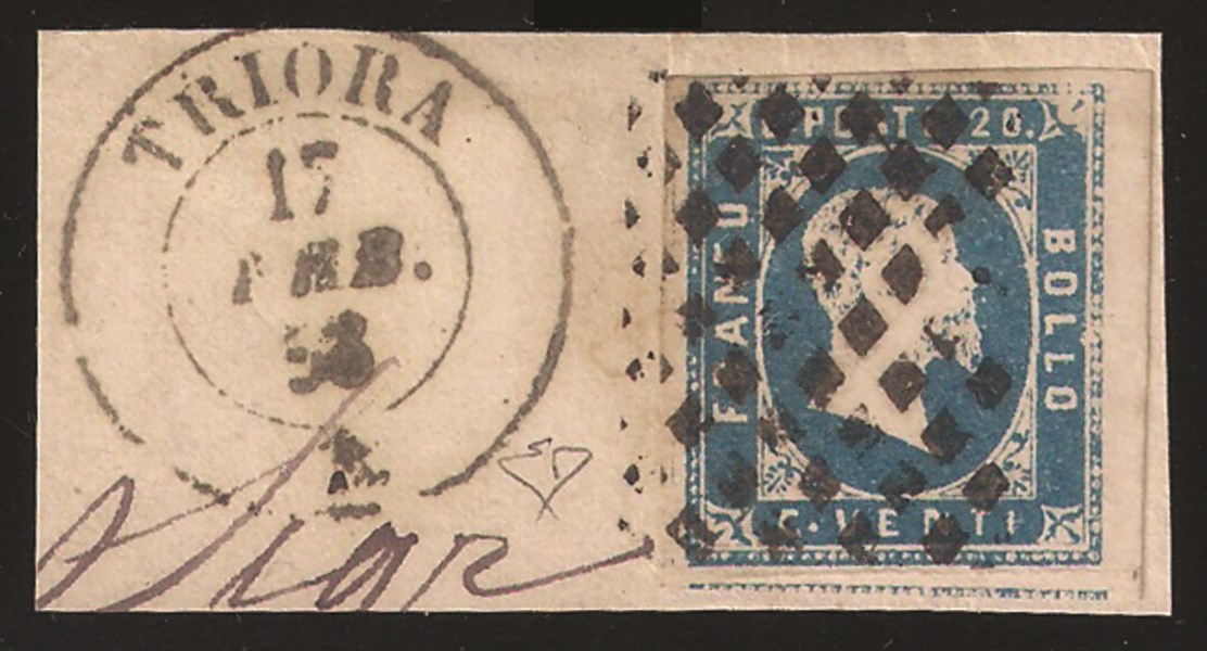 Annullato a rombi + a lato d.c TRIORA 17 FEB.53 (p.ti 11), firma E.D.