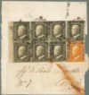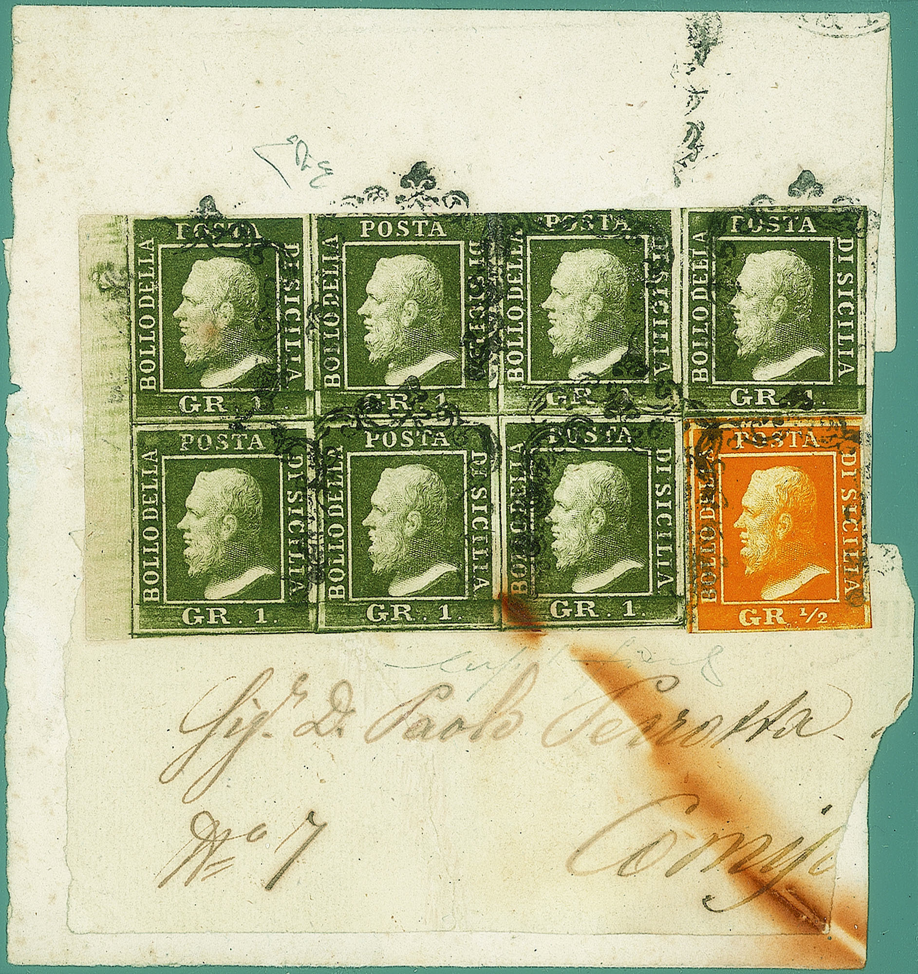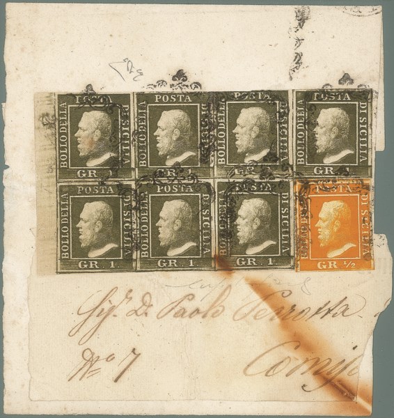 Affrancato con blocco di sette del gr.1 verde oliva, terza tavola, pos 11/14 e 21/23 con ampio bordo di foglio a sinistra + gr.1/2 arancio, seconda tavola (2, 5d), cert. A.Diena ed E.Diena. Si tratta certamente di una delle massime rarità note della collezione di Sicilia