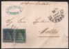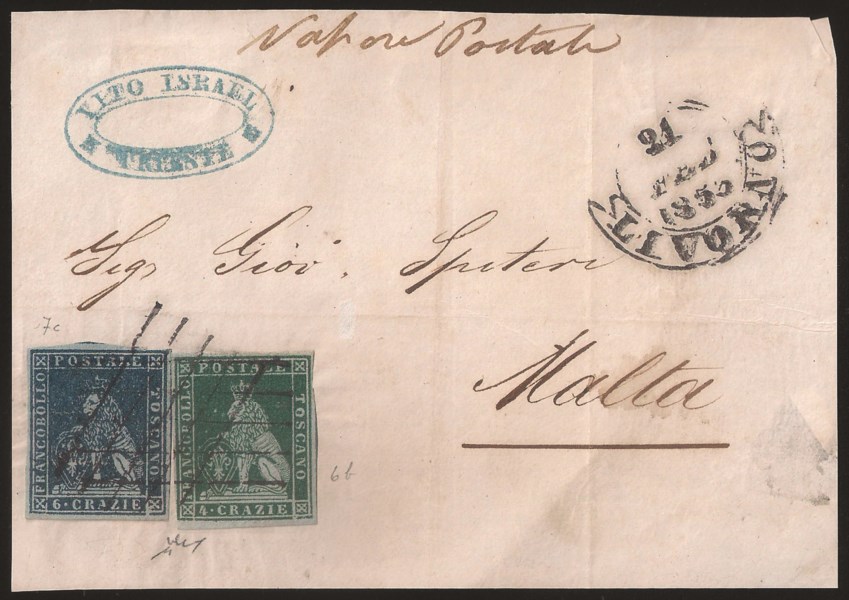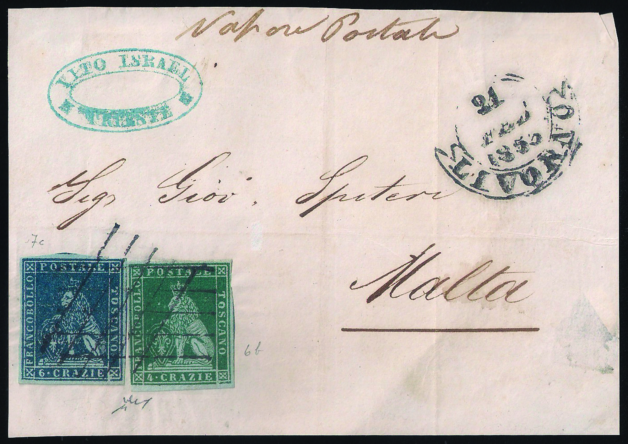 Affrancato con cr. 4 verde scuro su azzurro e cr.6 azzurro violaceo su azzurro (6b + 7b) annullati con muto a cinque sbarre incrociato con a lato il bollo LIVORNO 21 FEB.1853 per Malta, bella qualità