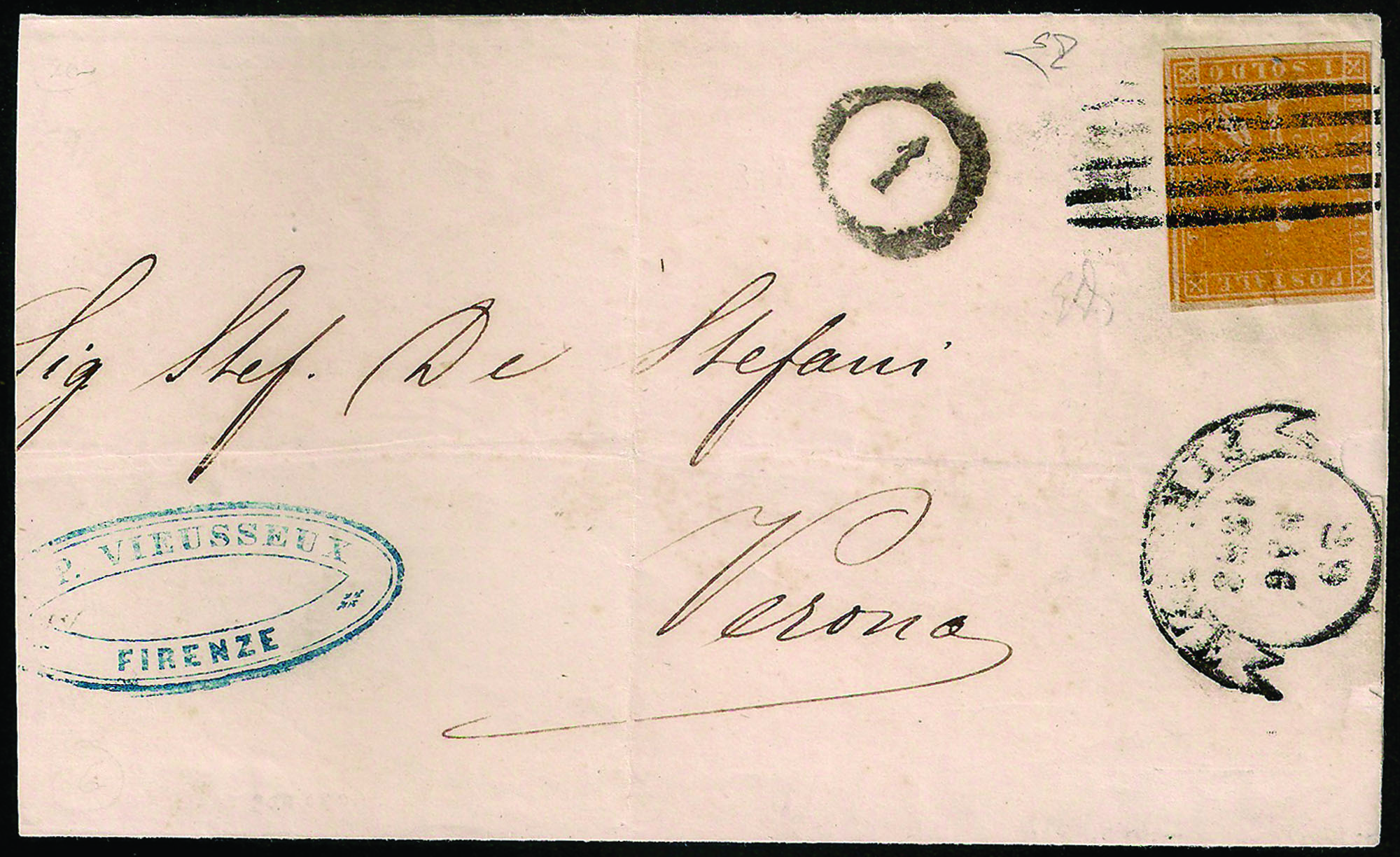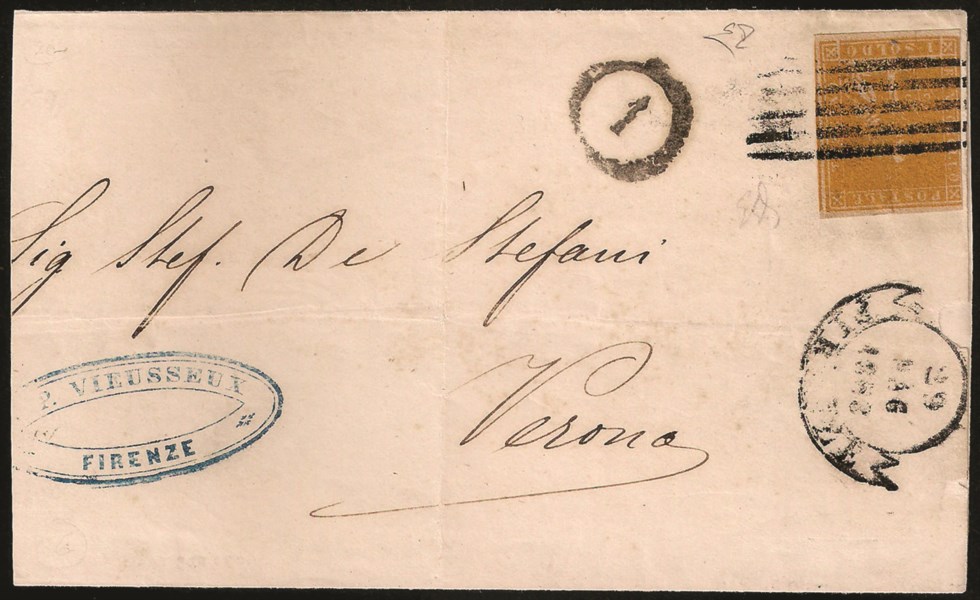 Con tre grandi margini, annullato col muto a cinque sbarre da FIRENZE 29 MAG.1858 per Verona con bollo 1 di distribuzione sul fronte, raro esemplare su lettera, insieme di ottimo aspetto.