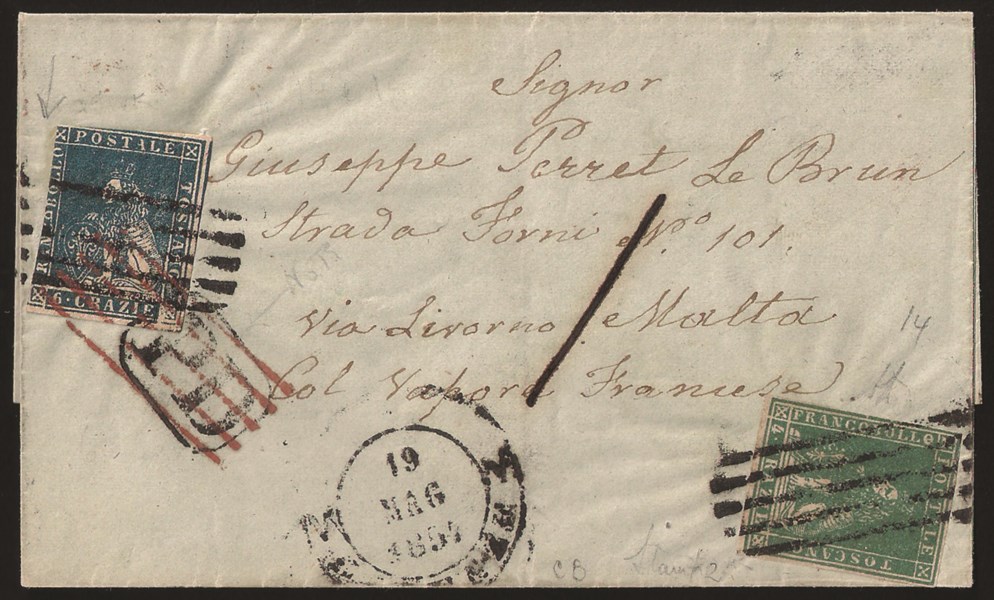Antichi Stati Italiani - Toscana - Lettera per Malta con cr.4 verde + cr.6 azzurro vivo, difettoso (14 + 15a)