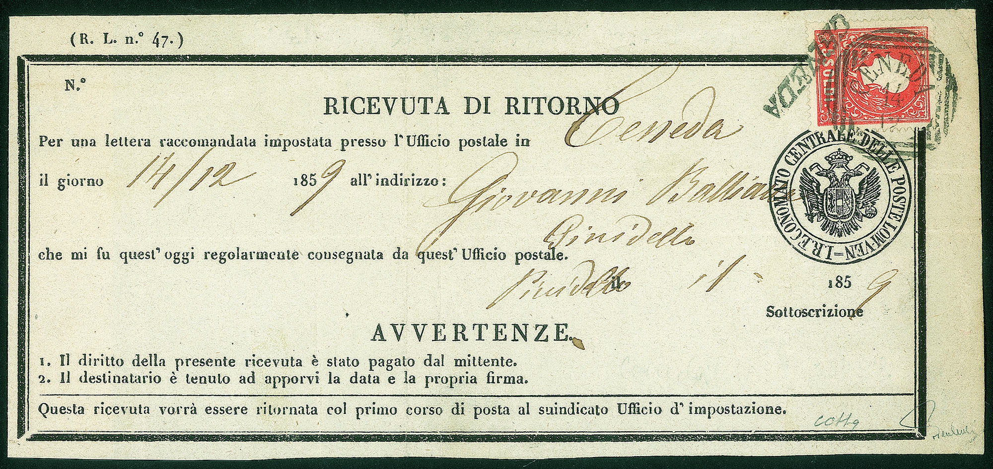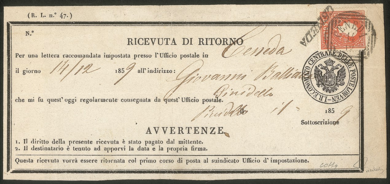 Antichi Stati Italiani - Lombardo Veneto - Ricevuta di ritorno da Ceneda affrancata con 5 soldi (30)