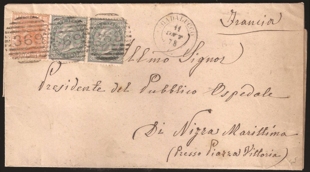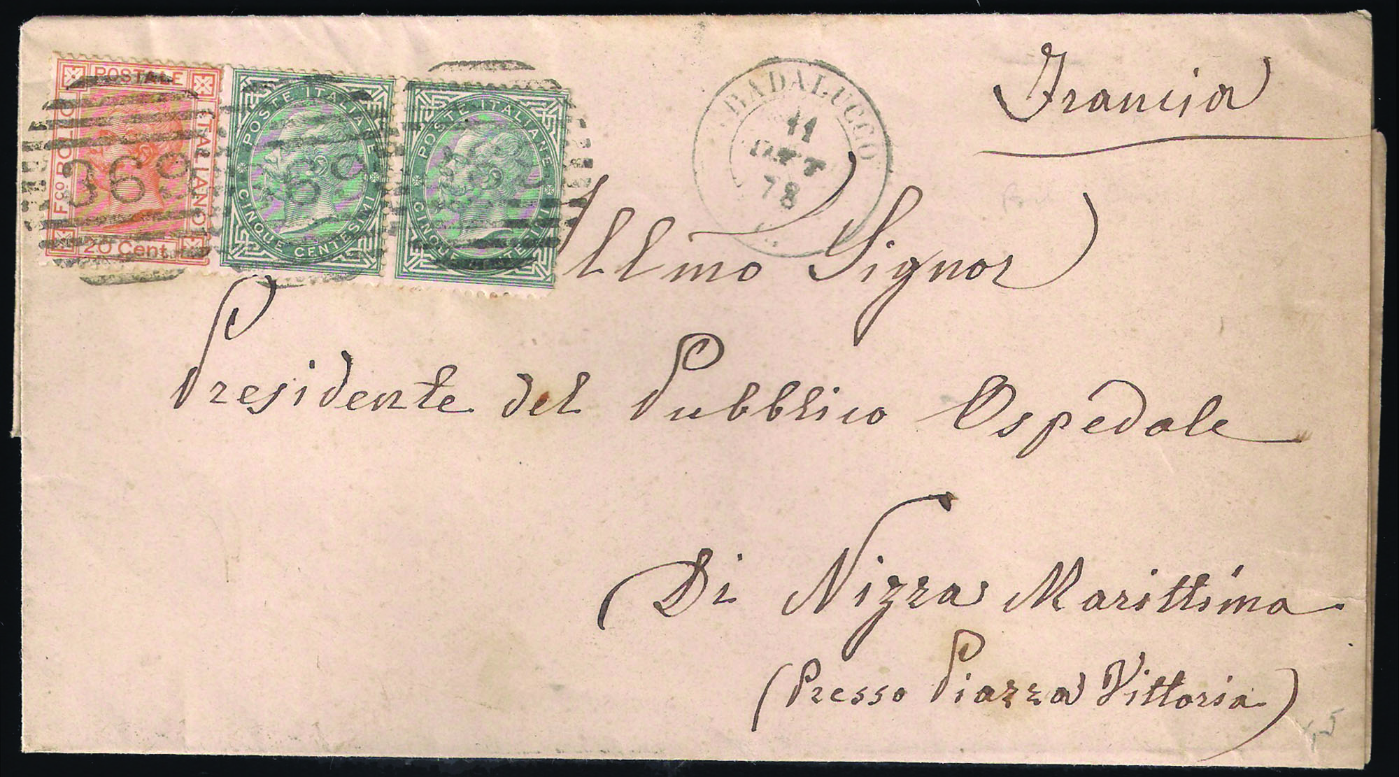 Affrancata con Effigie coppia c.5 verde grigio + c.20 arancio (T16 + 28) annullati col numerale a sbarre 369 e a lato doppio cerchio BADALUCCO 11 OTT.78, raro e di qualità molto bella
