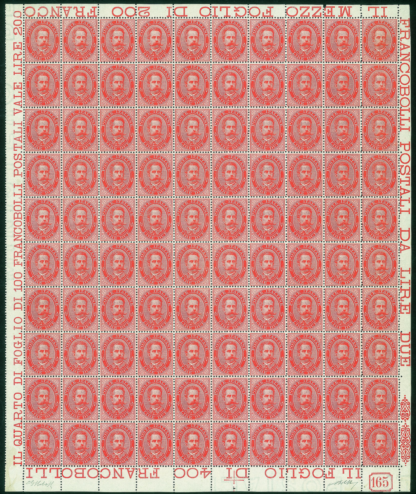 Regno - Umberto I - 1879 - Splendido foglio intero di 100 esemplari del 2 lire Umberto (43)