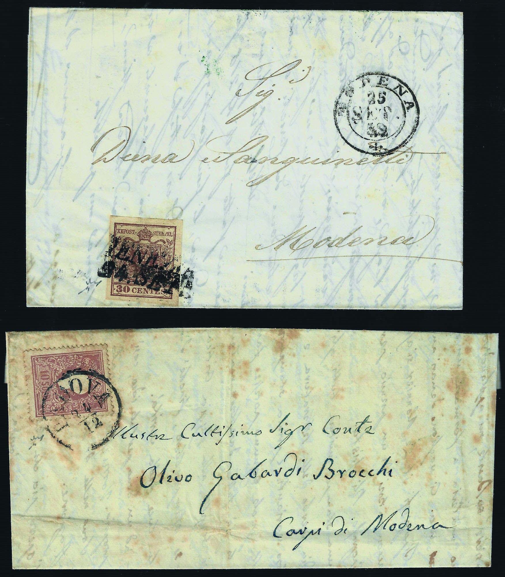 Una con c.30 bruno della prima emissione e una con s.10 bruno della seconda emissione dirette nel ducato di Modena