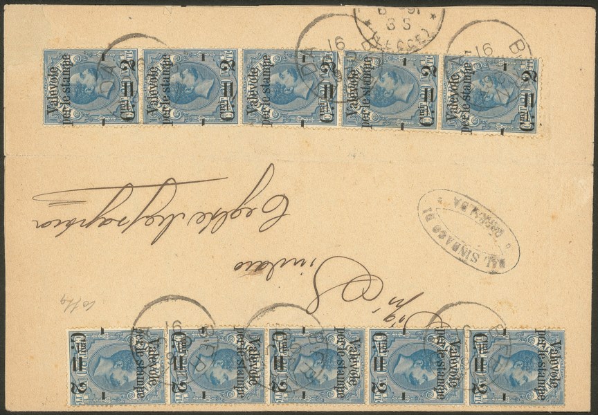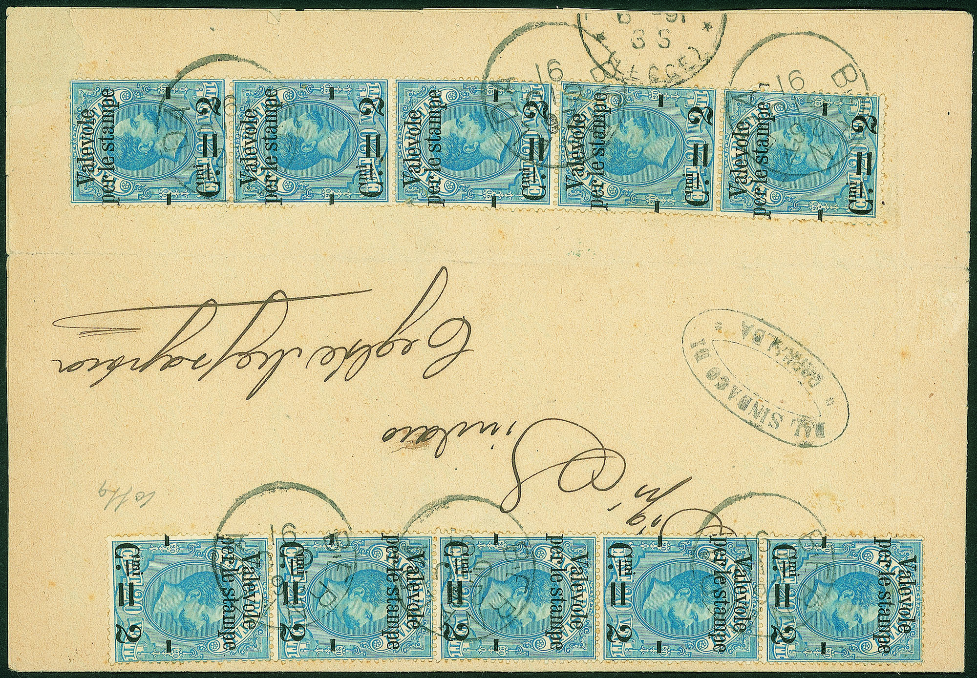 Regno - Umberto I - Plico affrancato fronte retro con due strisce di cinque del 2 cent su 20 Valevole per le Stampe (51)