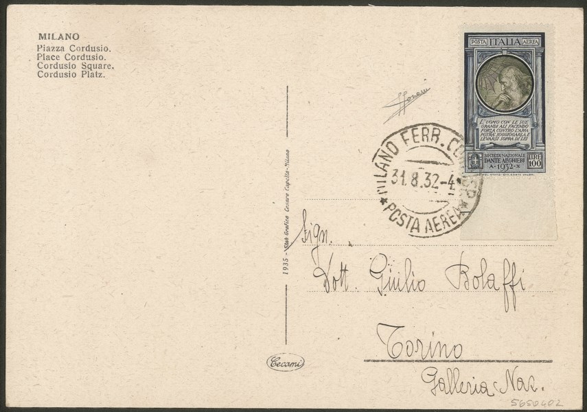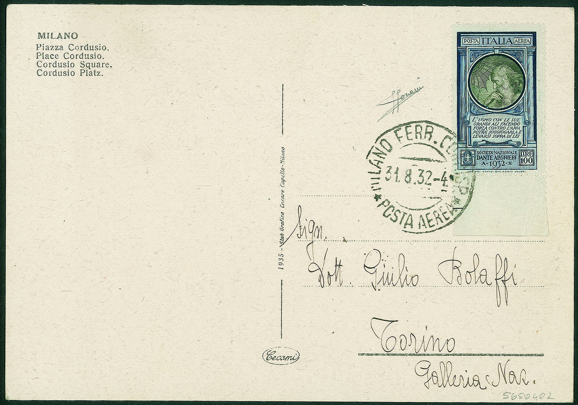 Regno - Posta Aerea e Aerogrammi - Cartolina affrancata con 100 lire Aerea Dante bordo di foglio (A41)