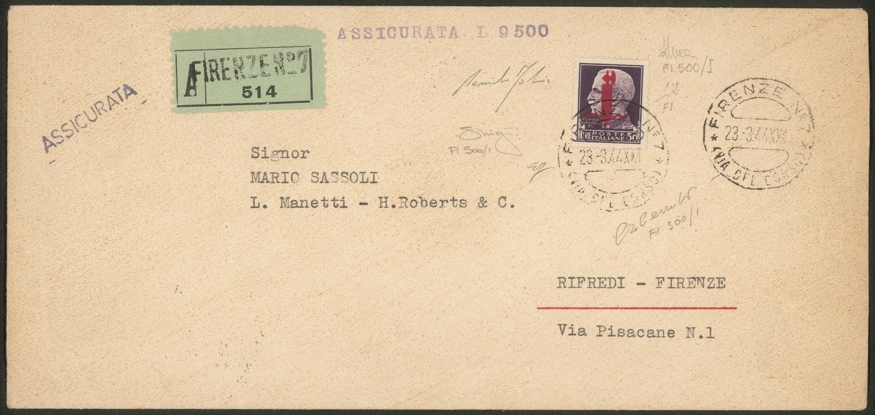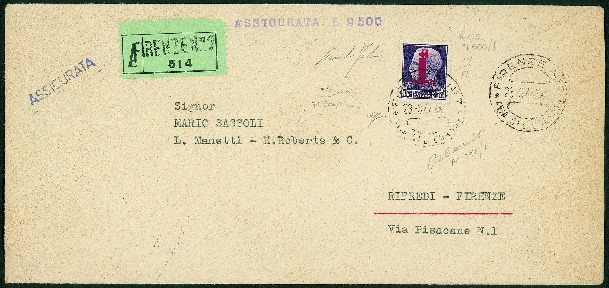 Affrancata con 50 lire fascio carminio lillaceo (500/I) emissione di Firenze in uso isolato - busta per città Firenze 23.3.44 - molto bella rara e di ottima qualità - cert. Fiecchi + cert. oro Raybaudi + cert. Andreoni