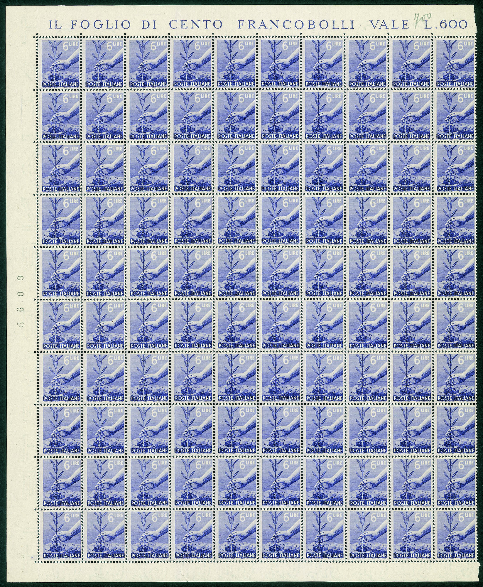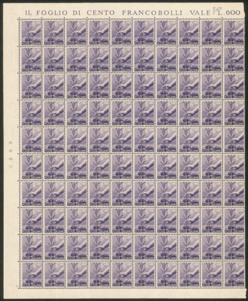 Italia - Repubblica - 1947/ - Intero foglio di 100 esemplari del 6 lire Democratica (556)