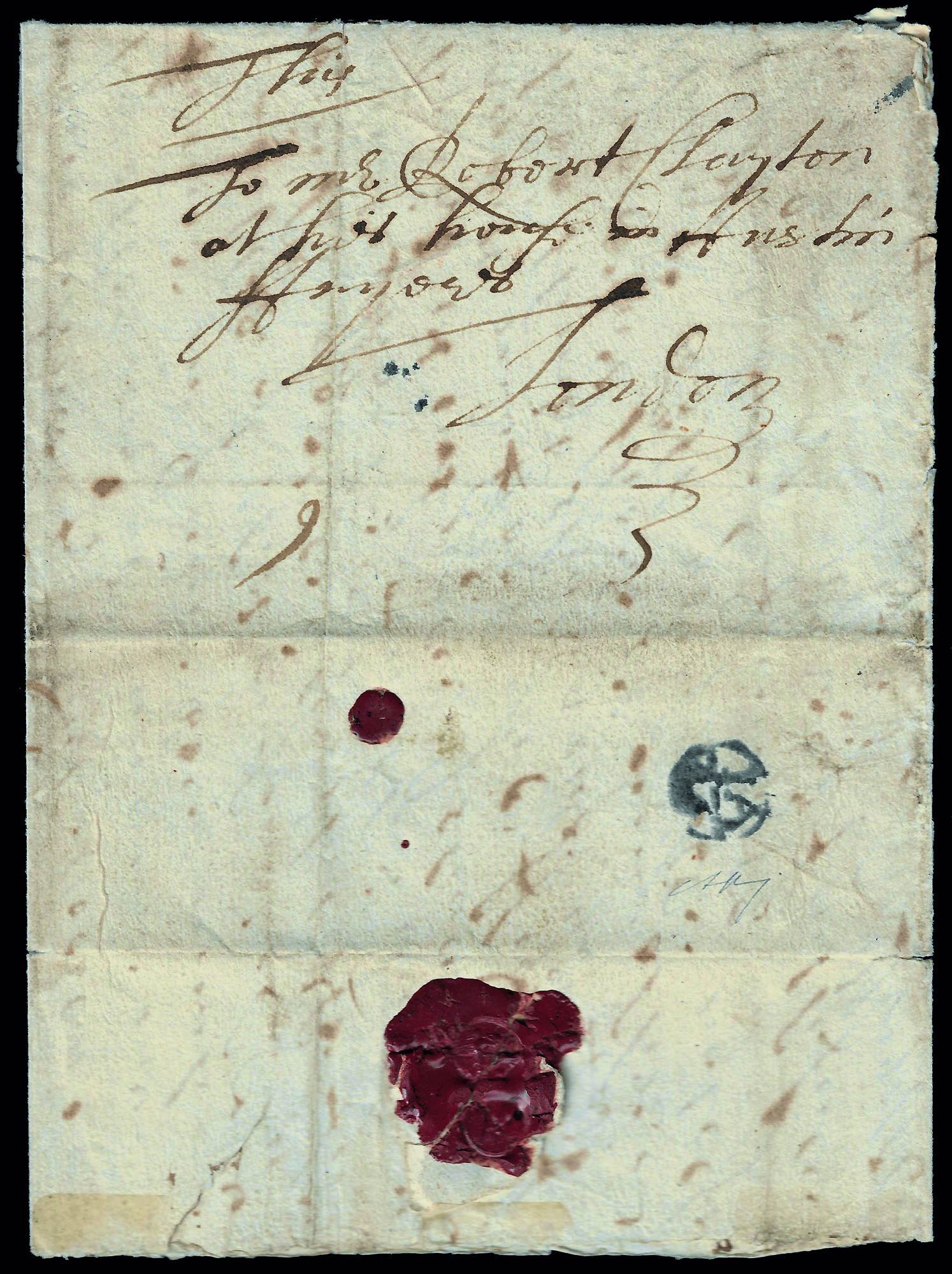 Lettera tassata per 9 pence con al verso sigillo in ceralacca rosso. Il timbro bishop fu introdotto nel 1661 dal Postmaster General inglese Henry Bishop per gestire la corrispondenza nella capitale. Veniva così apposto, per la prima volta al mondo, un timbro con giorno e mese per controllare l'operato dei postini a Londra, dato che si riscontravano ritardi nelle consegne. (ex collezione Robson Lowe). Allegato regesto.