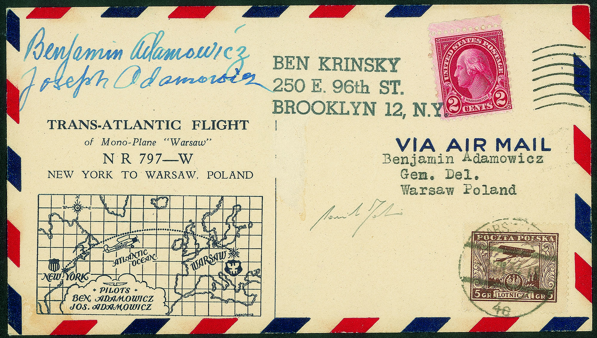 Aerogramma del volo con affrancatura mista USA/Polonia e firme autografe dei due fratelli piloti Adamowicz - cert. Fabris