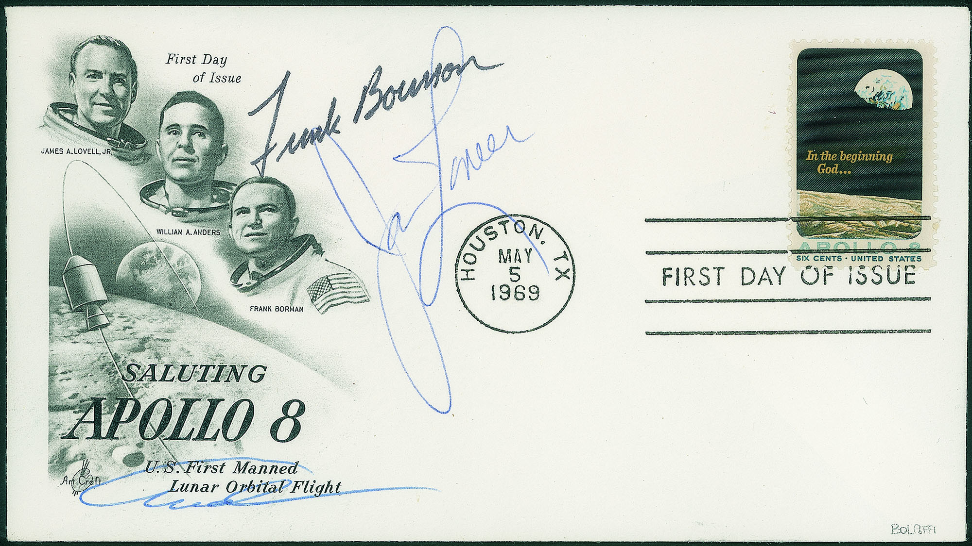 Con firme autografe degli astronauti F. Borman J. Lovell e B. Anders - annullo Huston TX 5.5.69 - molto bella - cert. finanziario Bolaffi 100%