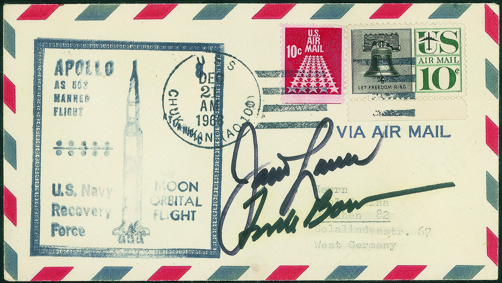 Seconda missione Apollo con equipaggio umano e che per la prima volta entra nell'orbita lunare - annullo 21.12.1968, giorno del lancio e timbro della nave secondaria di recupero USS Chukawan - firme autografe di J.Lovell e F.Bormann, membri insieme a W.Anders del primo volo circumlunare ¿ ottima qualità