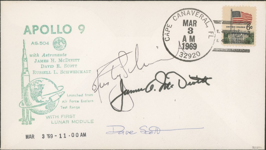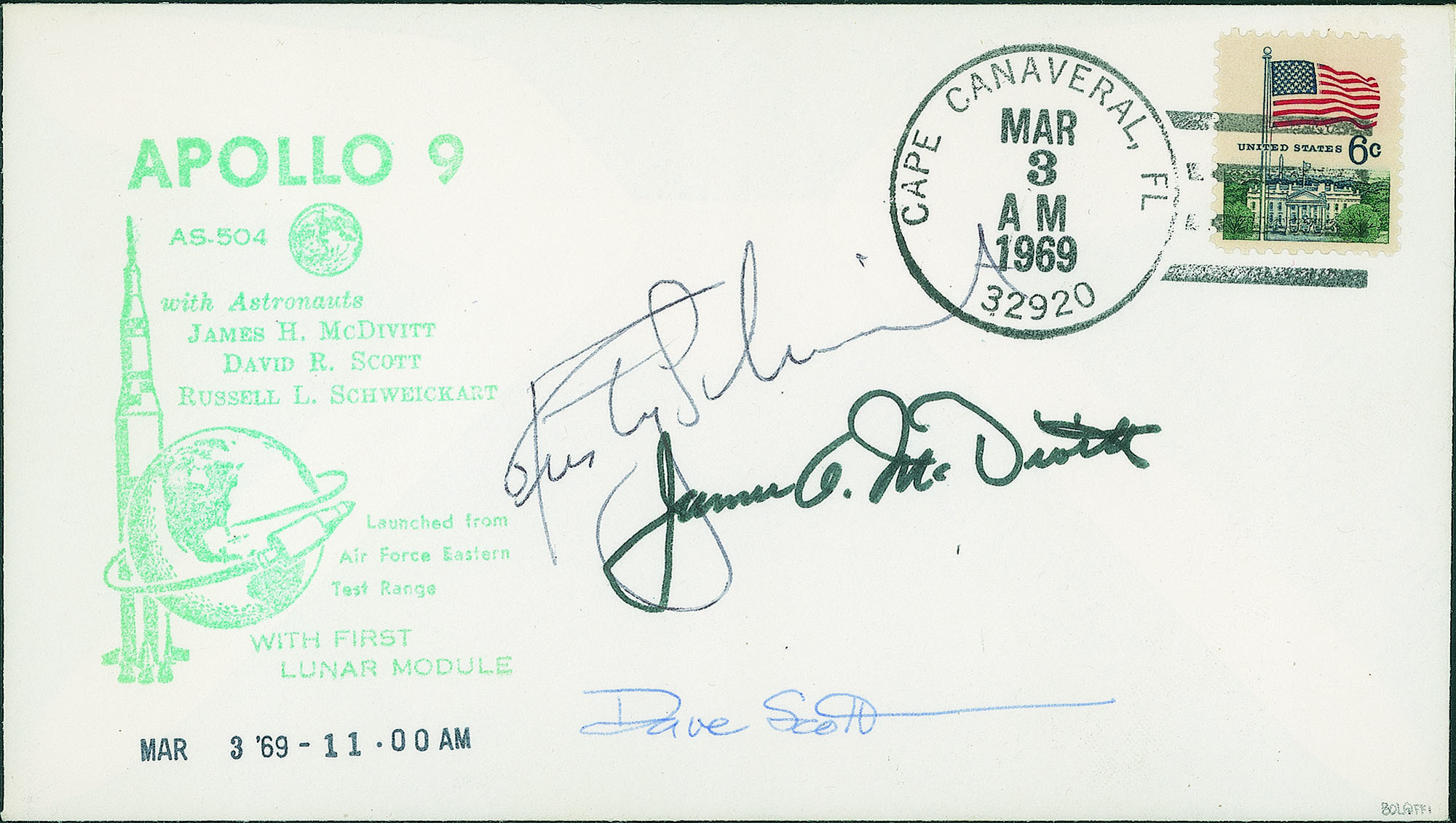 Busta commemorativa della missione con annullo Cape Canaveral Fl. 3.3.69 e firme autografe degli astronauti R. Schweickart J. Divitt e D. Scott - molto bella - Bolaffi