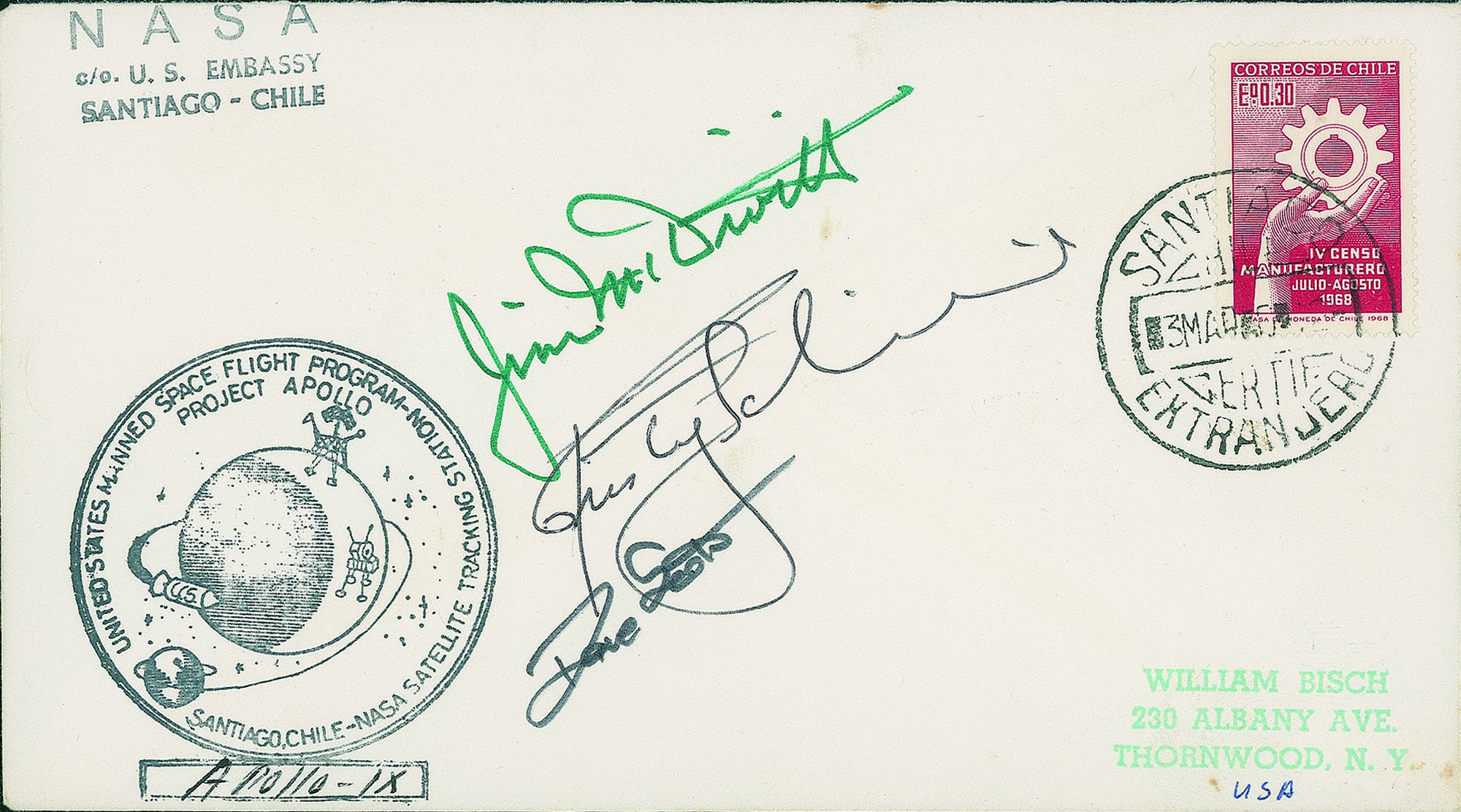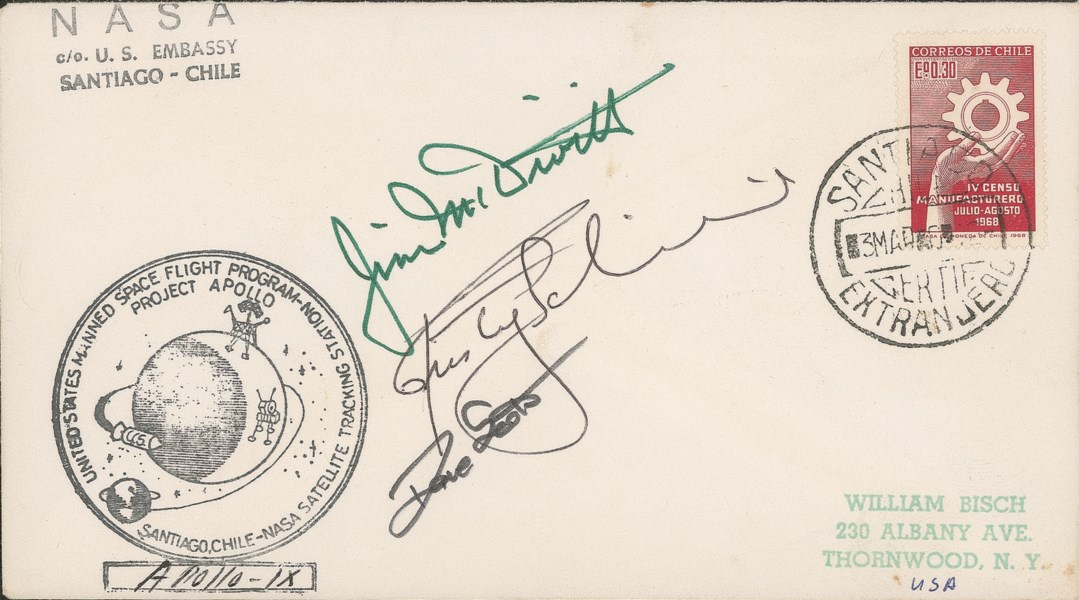 Busta commemorativa del primo volo umano in orbita terrestre con il Lem - firme autografe degli astronauti J. McDivitt D. Scott e R. Schweickart