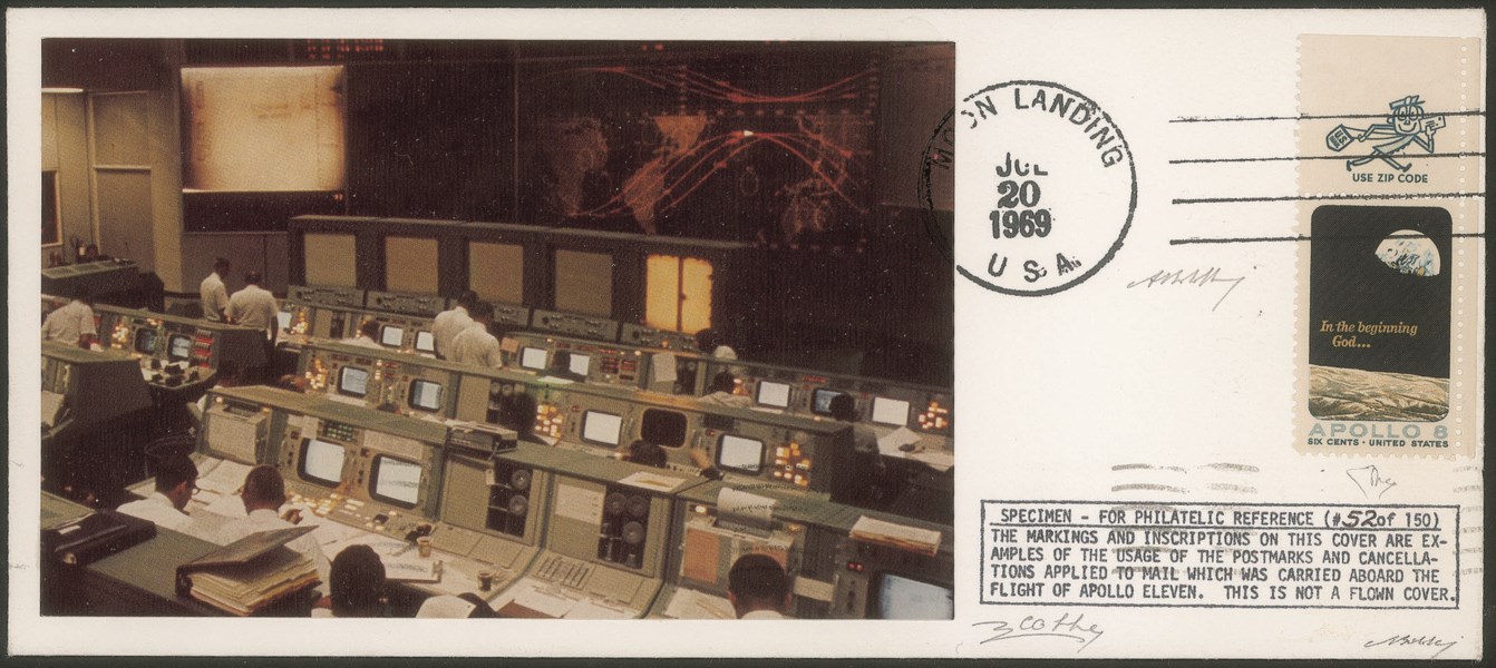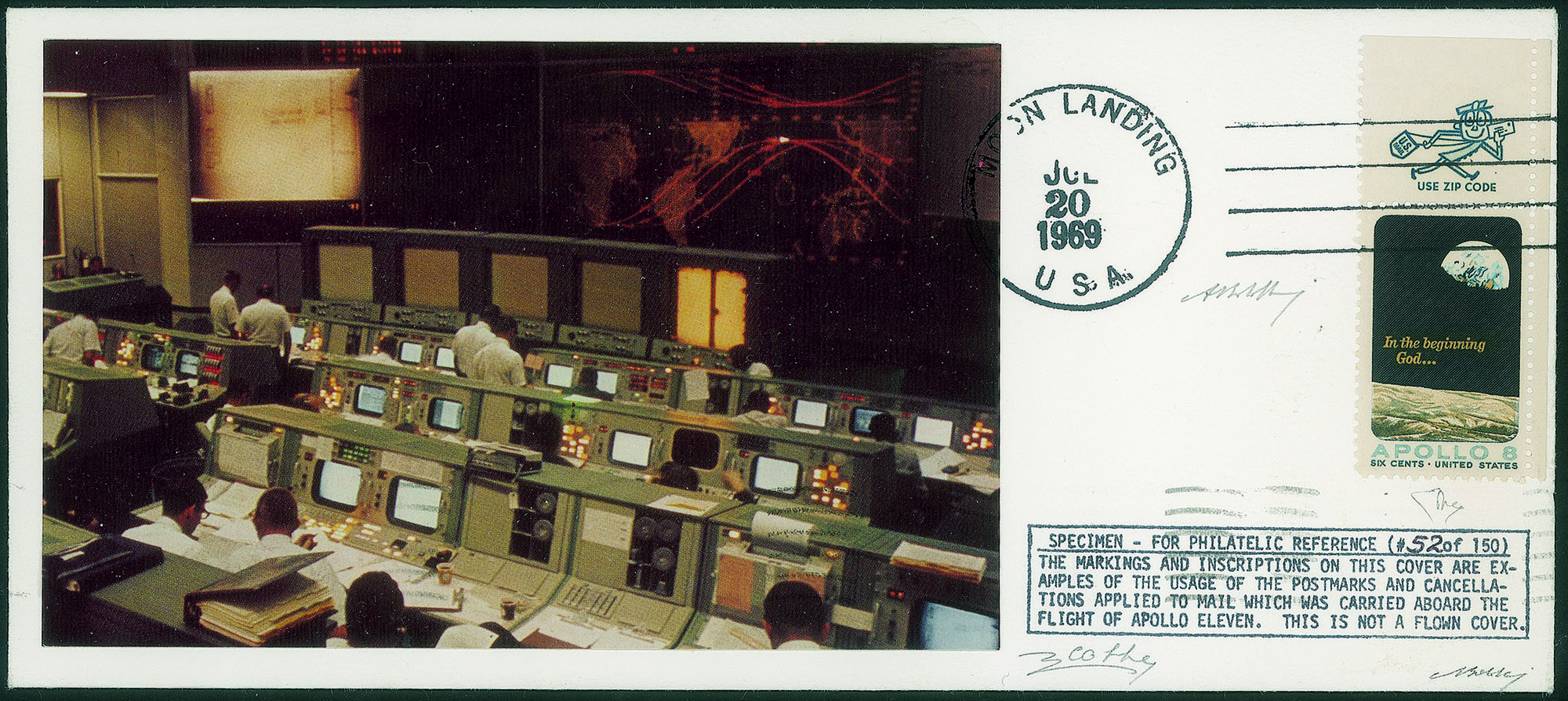 Busta commemorativa n.52 di 150 con 6 cent Apollo 8 e bollo circolare Moon Landing Jul 20 1969 USA apposto sperimentalmente in laboratorio su 150 buste prima della partenza dell'Apollo 11 - al verso altro 6 cent + bollo lineare nero su tre righe relativo alla quarantena presso il laboratorio lunare di Houston e annullo Webster. TX Aug 11 PM 1969 apposto dopo l'uscita dell'equipaggio dalla quarantena - non comune l'immagine del Centro di Controllo - busta rara e di ottima qualità - E.Diena + cert. Colla + cert. Finanziario Bolaffi 100% e conferma manoscritta qualità