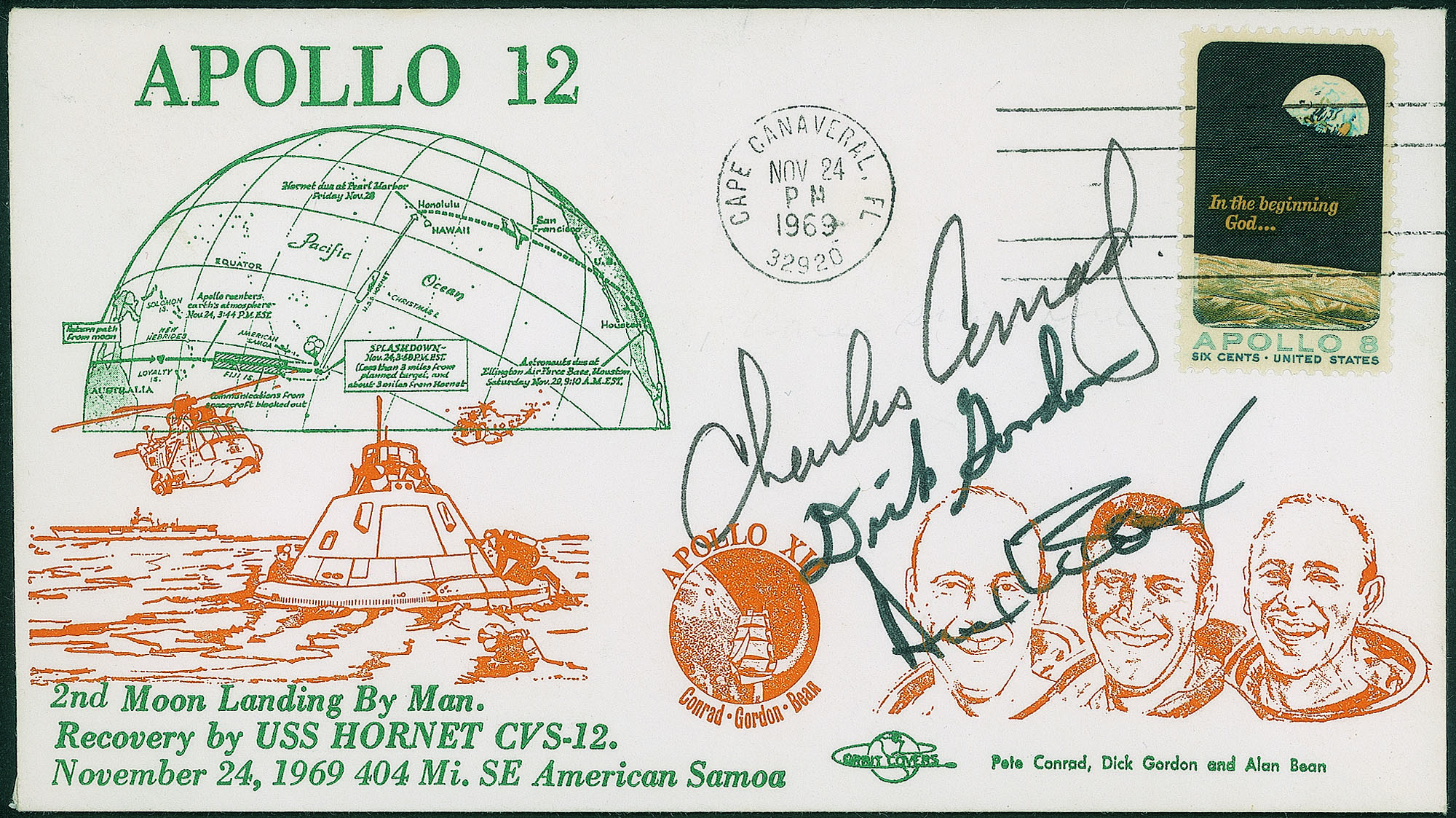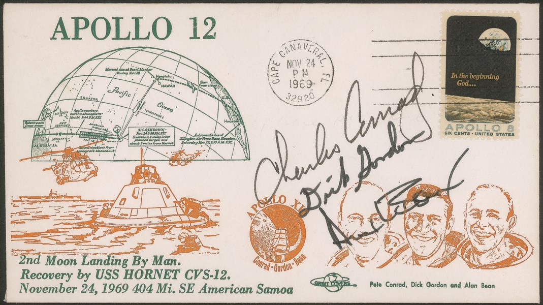 Busta commemorativa della missione annullo 24.11.1969 data dell'atterraggio - firme autografe dell'equipaggio della storica missione: Charles Conrad, Richard Gordon e Alan Bean - molto belkla e di ottima qualità - cert. finanziario Bolaffi 100%