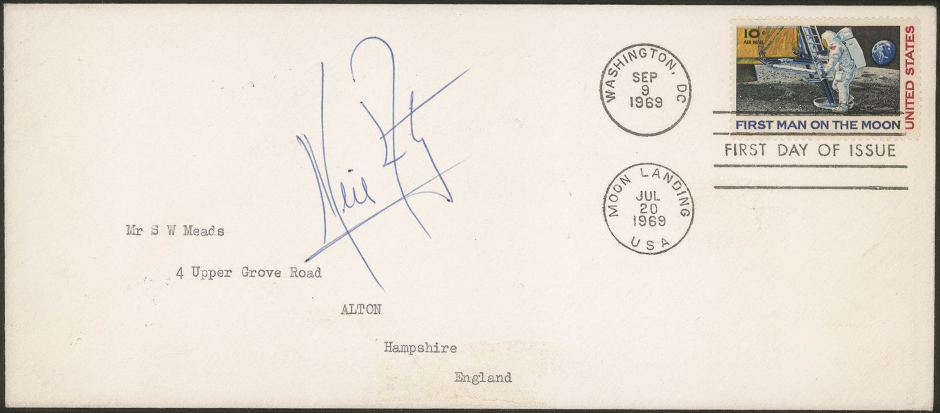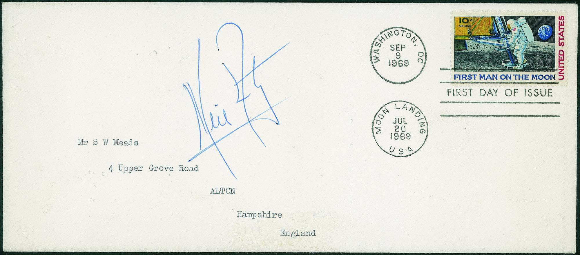 Busta annullata Moon Landing 20.7.69 e Washington DC 9.9.69 con firma autografa dell'astronauta N. Amstrong apposta in occasione della visita presso il Royal Aircraft Establishment del 22.6.71 - una delle due buste conosciute come da copia del documento allegato - molto bella e rara