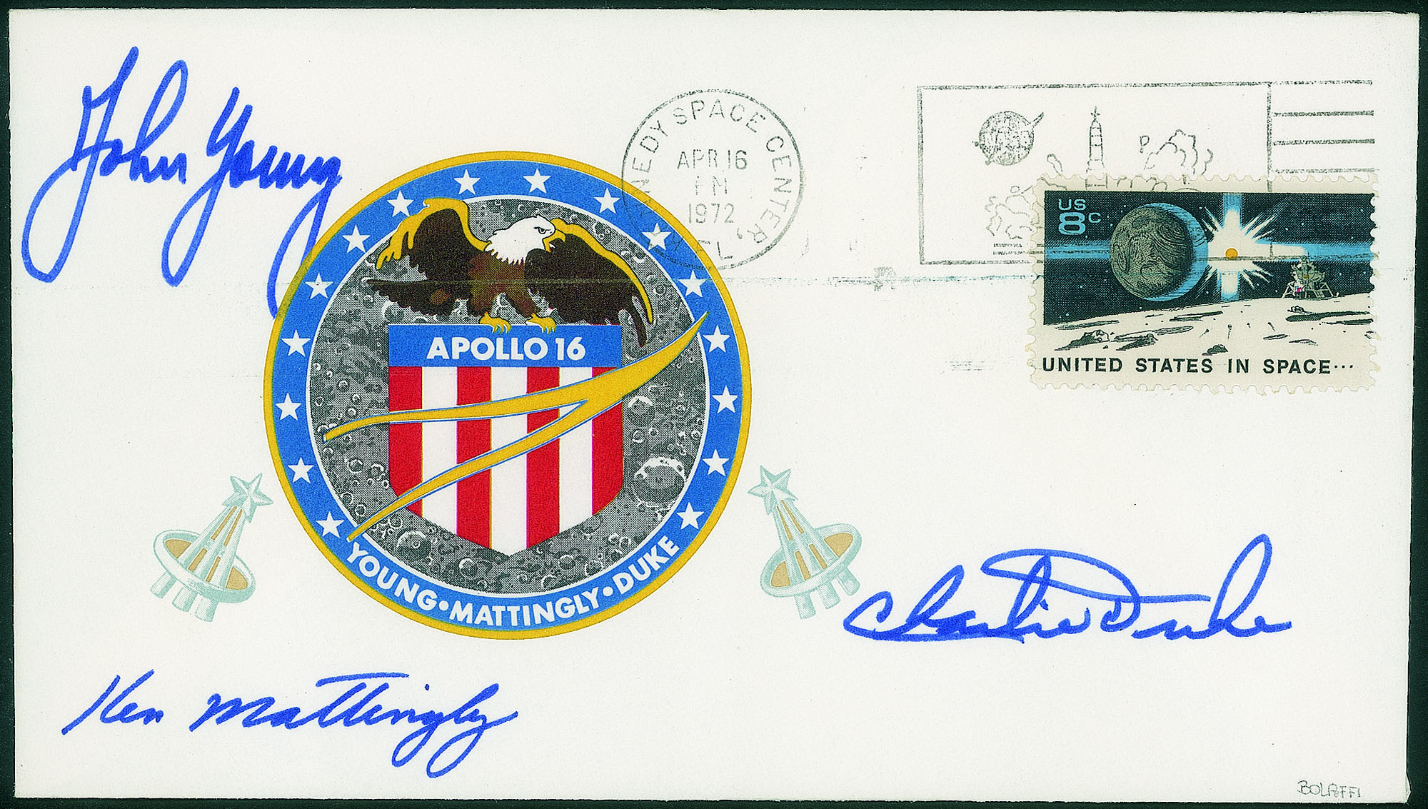 Insurance cover - busta commemorativa Apollo XVI con firme autografe degli astronauti J. Young K. Mattingly e C. Duke - molto bella - cert. finanziario Bolaffi 100%