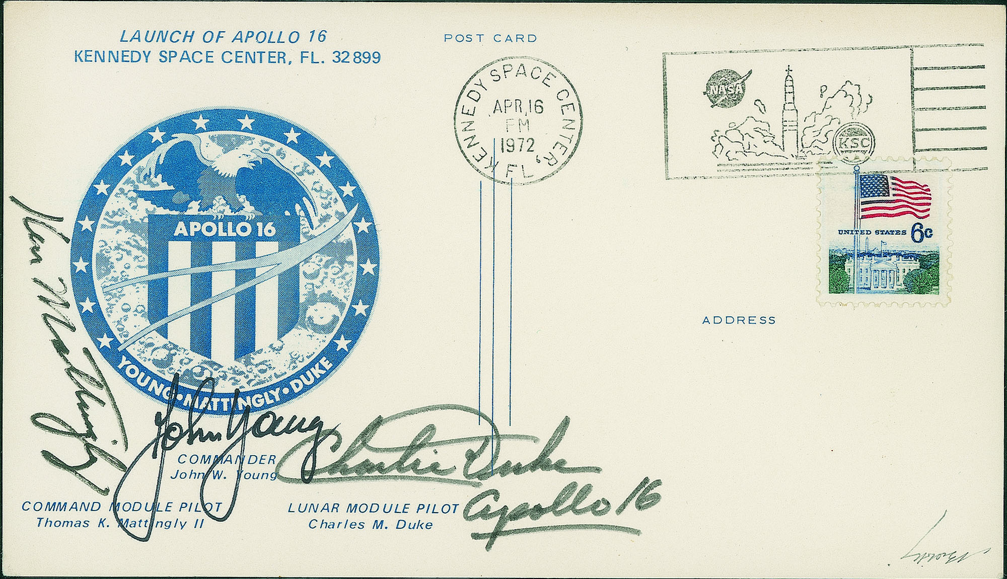 Cartolina commemorativa annullata Kennedy Space Center Fl. 16.4.72 e con firme autografe degli astronauti Young Mattingly e Duke - cert. finanziario Bolaffi 100%