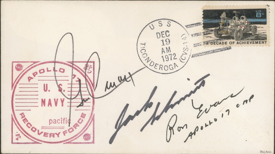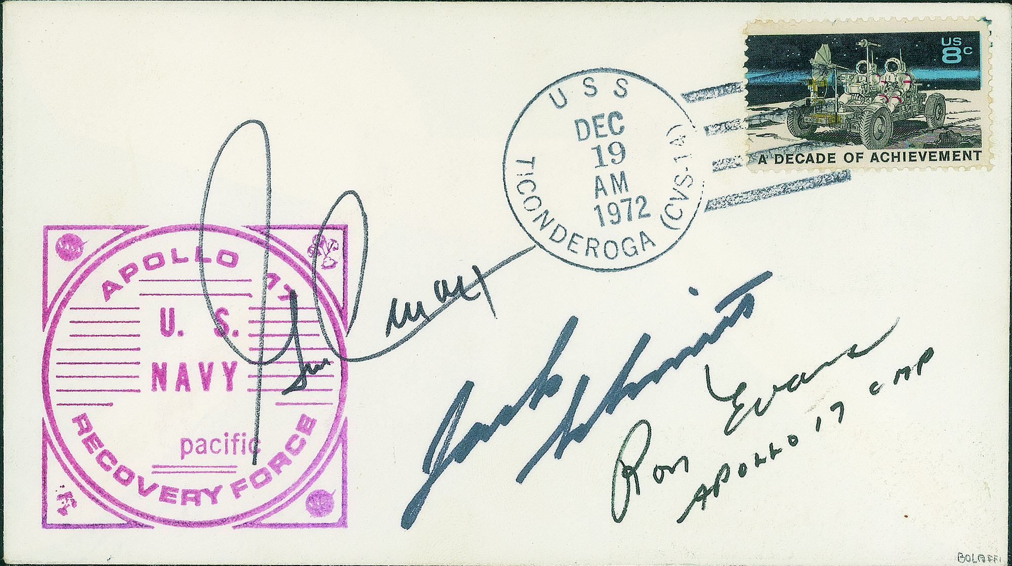 Ultima missione con equipaggio del programma Apollo - busta commemorativa dell'ammaraggio annullata a Ticonderoga 19.12.72 e firme autografe degli astronauti G. Cernan R. Evans e H. Schmitt + cert. finanziario Bolaffi 100%