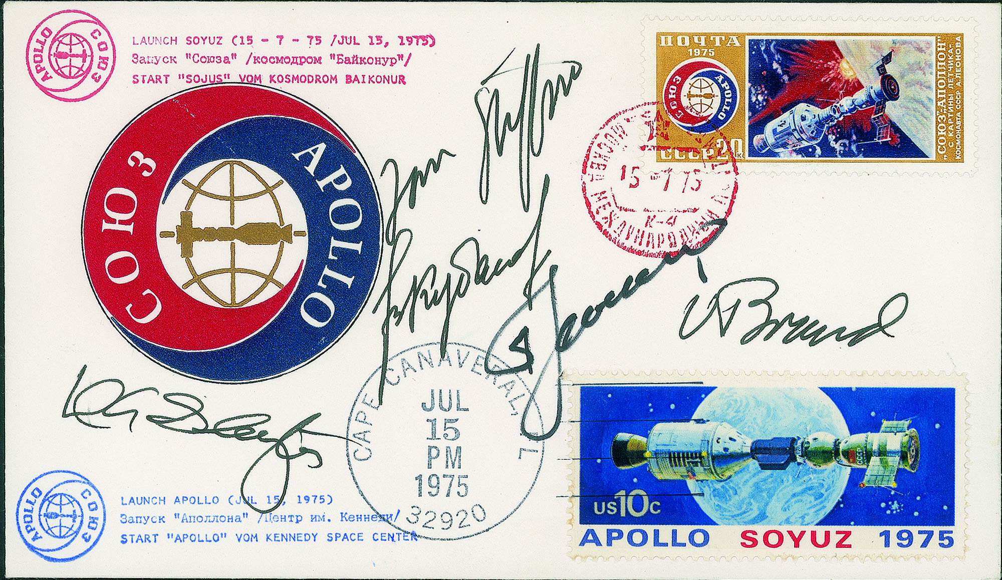 Busta commemorativa della missione compiuta Apollo/Soyuz del 15.7.75 (data storica per la fine della corsa allo spazio) con firme autografe degli astronauti J. Statford V. Brand D. Slayton A. Leonov e N. Kubasov - molto bella e di ottima qualità