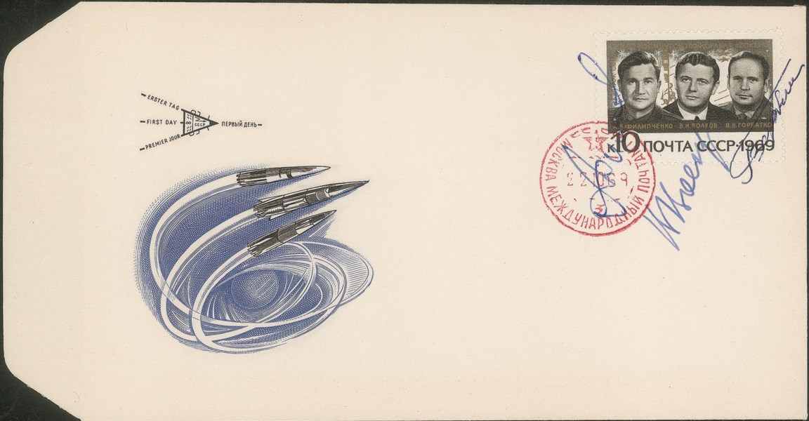 Busta commemorativa annullata 22.10.69 con firme autografe dell'equipaggio A. Filipchenko V. Gorbatko e V. Volkov
