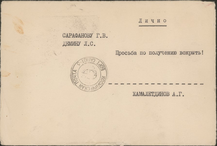 Busta dattiloscritta con i nomi dei 2 cosmonauti G.Sarafanov e L.Dyomin, trasportata tra il 26-28.8.1974 dalla Soyuz 15 in orbita (a causa di un problema tecnico la navicella non riuscì a realizzare l'aggancio) - nonostante l'incidente, raro timbro circolare Posta cosmonautica/bordo Salyut-3 agosto 1974, il primo con dicitura di posta spaziale utilizzato a bordo di una stazione orbitale - rara e di buona qualità - cert. di autenticità russo del 2016