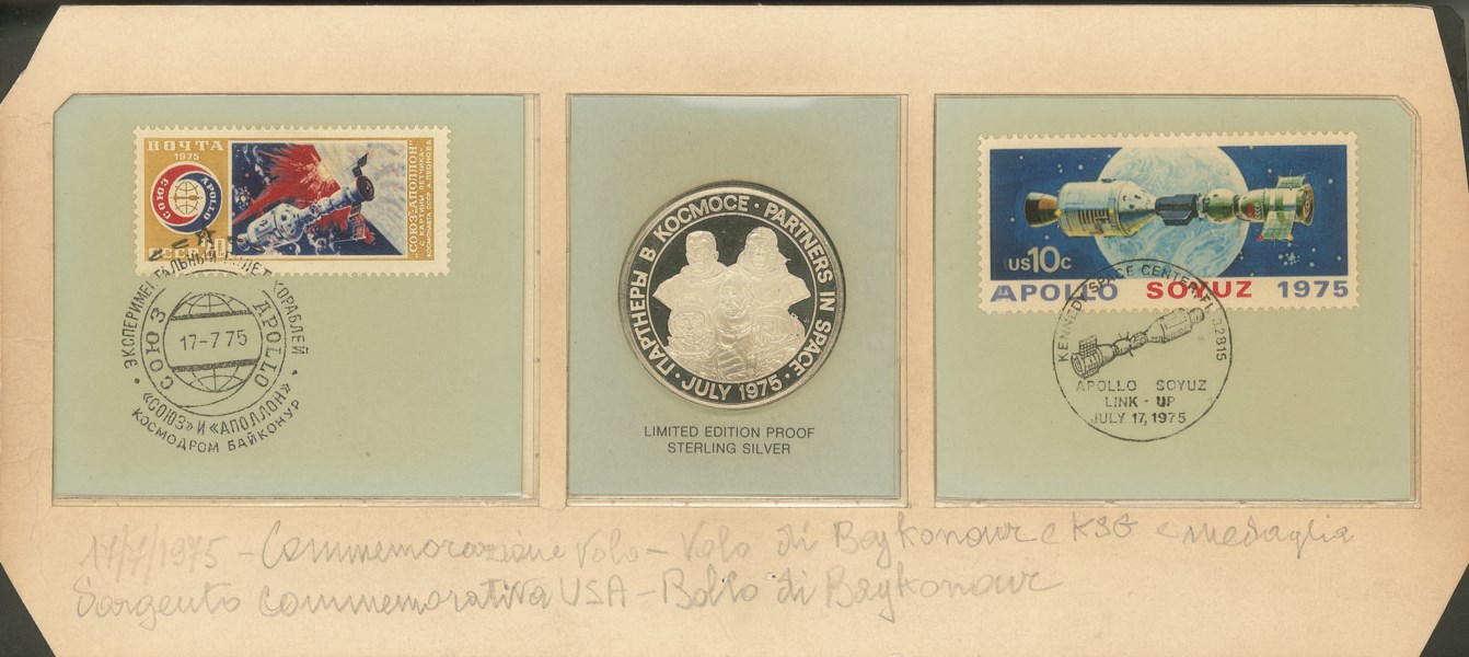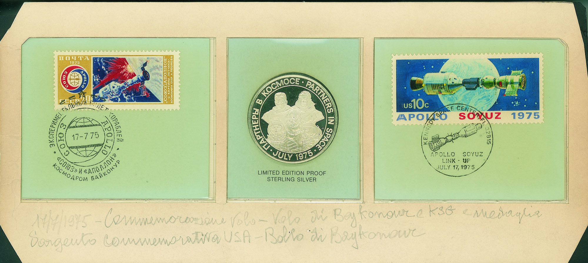 Blister commemorativo del volo da Bajkonur per emissione congiunta Apollo-Soyuz con i due valori annullati e medaglia in argento Partners in Space - missione storica che decretò la fine della corsa allo spazio