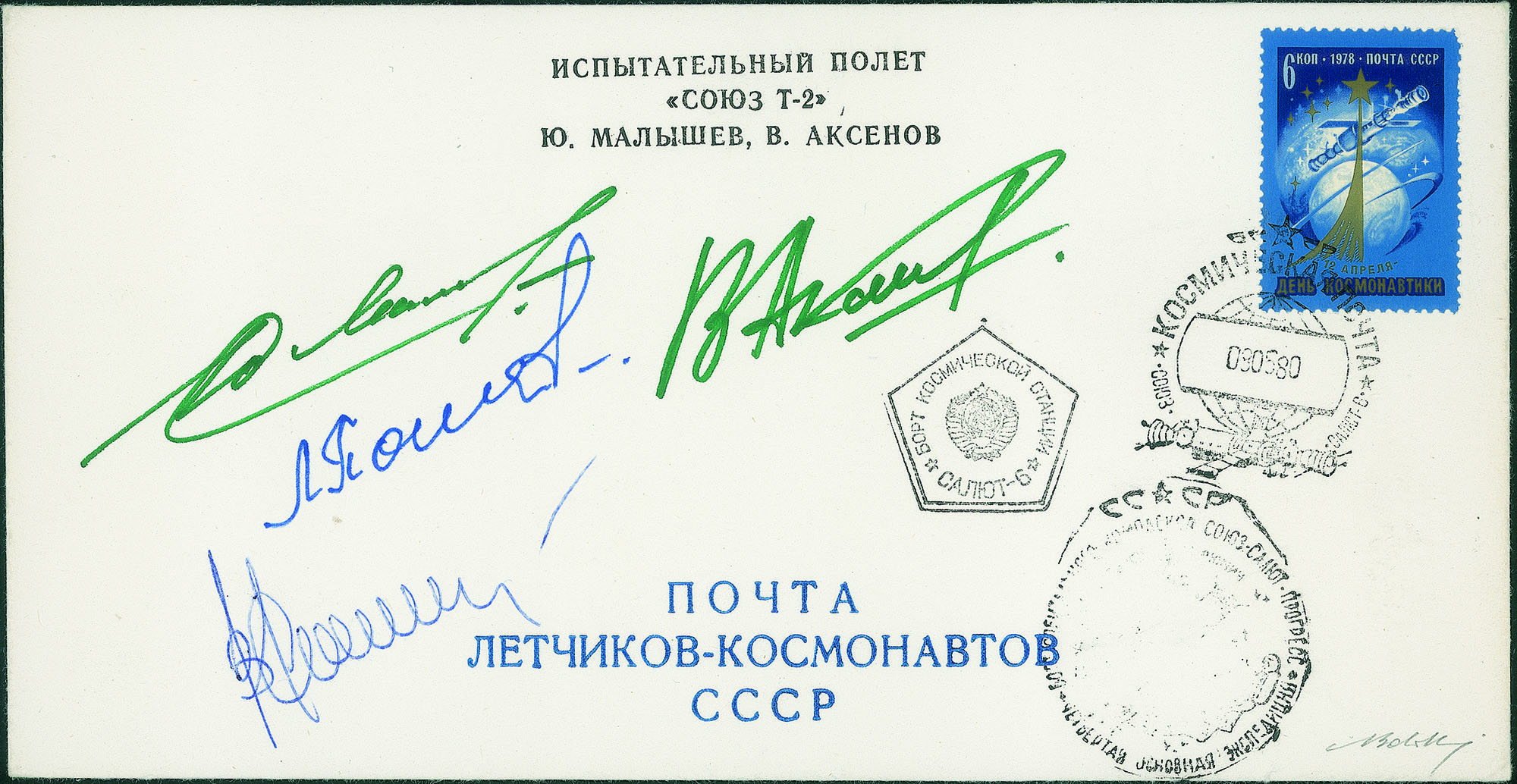 Cosmogramma del volo Soyuz T-2 (5.6.-9.6.1980), busta ufficiale posta dei cosmonauti Soyuz T-2 con i vari annulli e timbri di bordo: annullo sovietico CC*CP posta spaziale 08.06.80 Soyuz-Salyut-6, bollo pentagonale Salyut-6 e bollo circolare CC*CP 4° Equipaggio residente commemorativo dei giochi olimpici di Mosca 1980 - firme autografe dei cosmonauti V.Aksenov e Y.Malychev (Soyuz T-2), L.Popov e V.Ryumin (Soyuz-35) - ottima qualità - Bolaffi + cert. Kniga